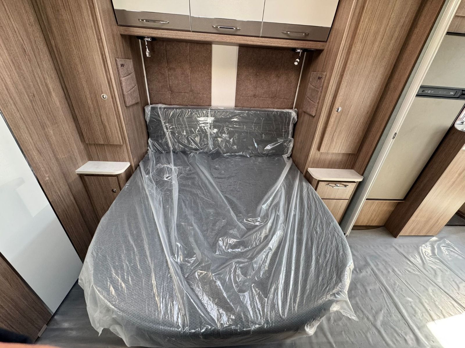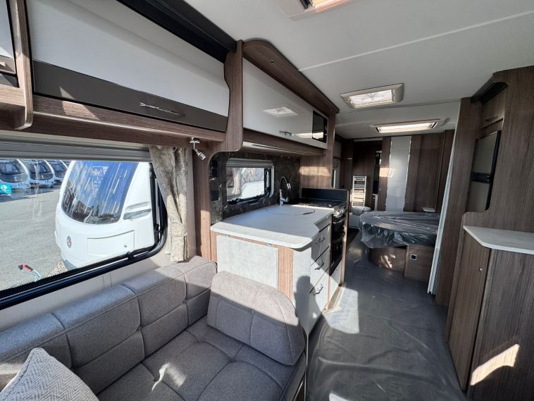 A high-spec 8ft-wide twin-axle 4-berth caravan, designed for exceptional space, high-end comfort, and modern features. Featuring a fixed island bed, spacious end washroom, and premium touring technology, this model is perfect for extended touring in style.