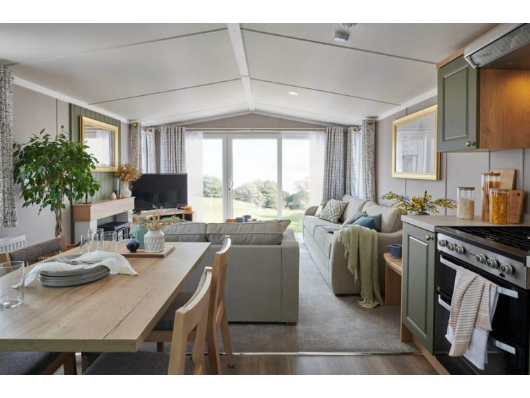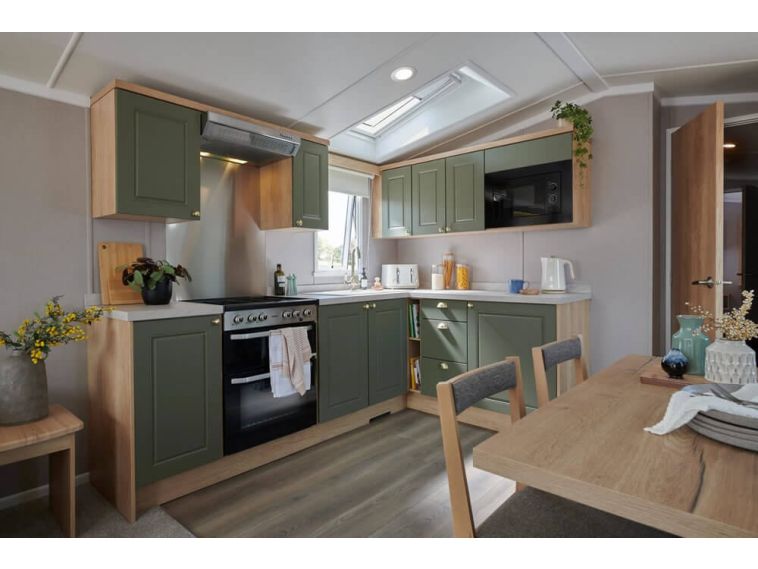 The sage green kitchen compliments the rest of the colour scheme perfectly. The integrated kitchen appliances include fridge freezer, microwave, double oven and gas hob. The dining table and chairs are free standing with comfortable dining for all.