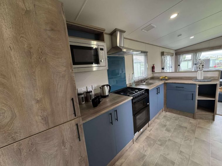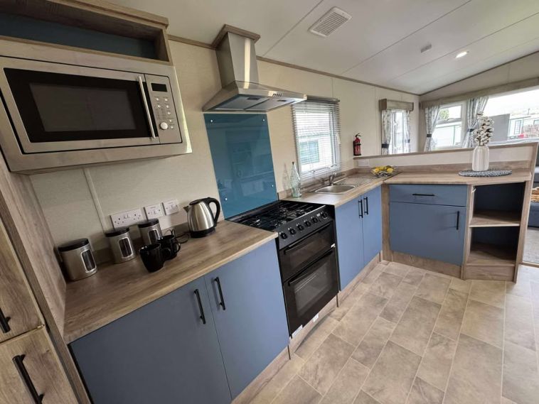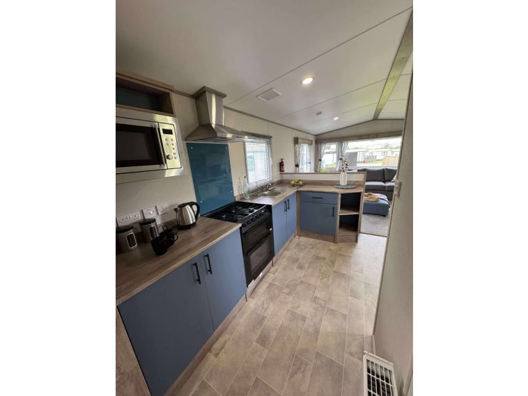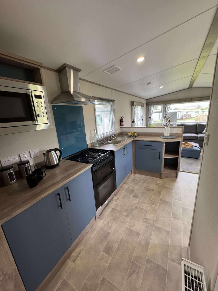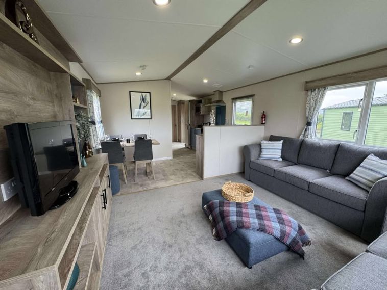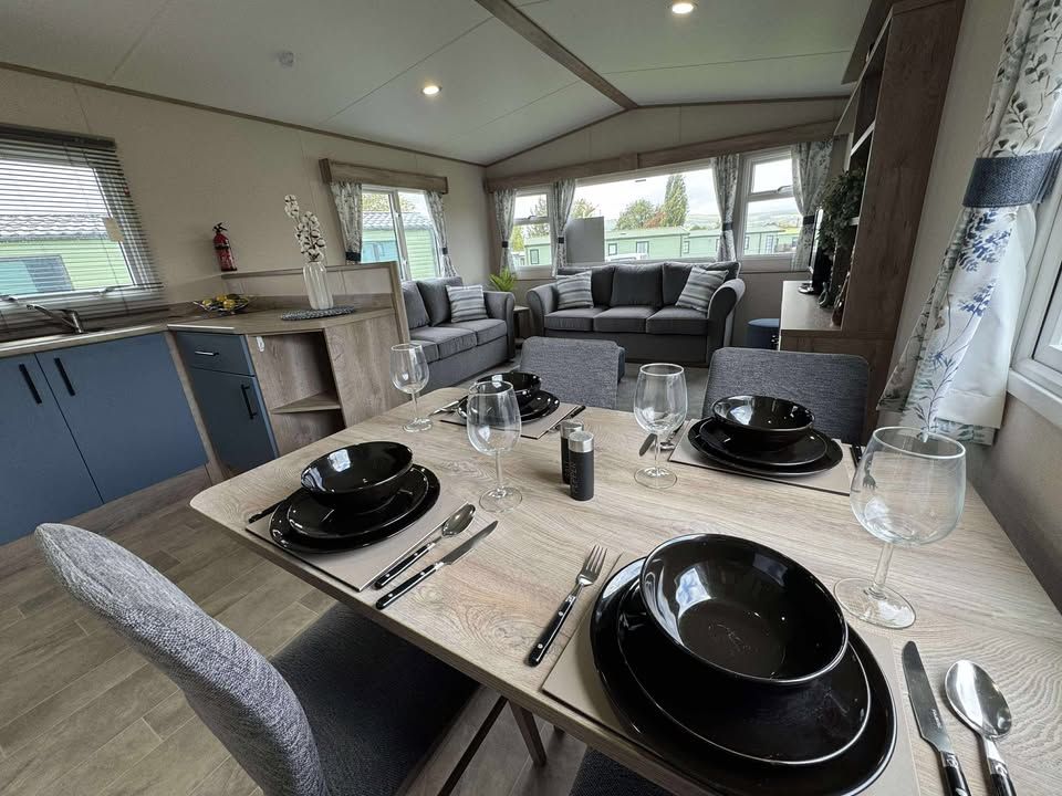 The Special Edition 2024 ABI Adelaide 36×12/2 Bed model offers a contemporary design and colour scheme. Lounge features comfy sofa style settees (with a pull-out bed), scatter cushions, footstool, and occasional table. The Lounge is fitted with a wall display and storage unit incorporating the TV point. The separate Dining area has a freestanding dining table and 4 dining chairs, with tub stools for additional seating. The Kitchen has both integrated fridge-freezer and microwave, gas cooker/hob with full glass splashback and extractor. The Main Bedroom has a King-size bed with lift up storage, fitted wardrobes, storage, a vanity area with stool and wall mount TV point. En-suite WC and wash basin. Twin Bedroom: 2 single beds, fitted wardrobe and bedside unit. Full Shower room. All mains services and car parking space. Children and pets are welcome, choice of pitch and finance available. Price includes, delivery, siting and connection, double glazing and central heating, steps, metal storage box, x2 47kg gas bottles, wifi, freesat tv connection and pitch fees until May 2026 for new customers.