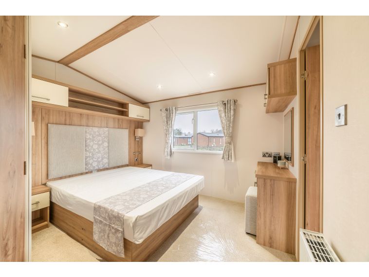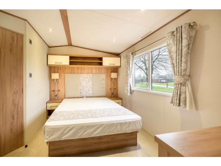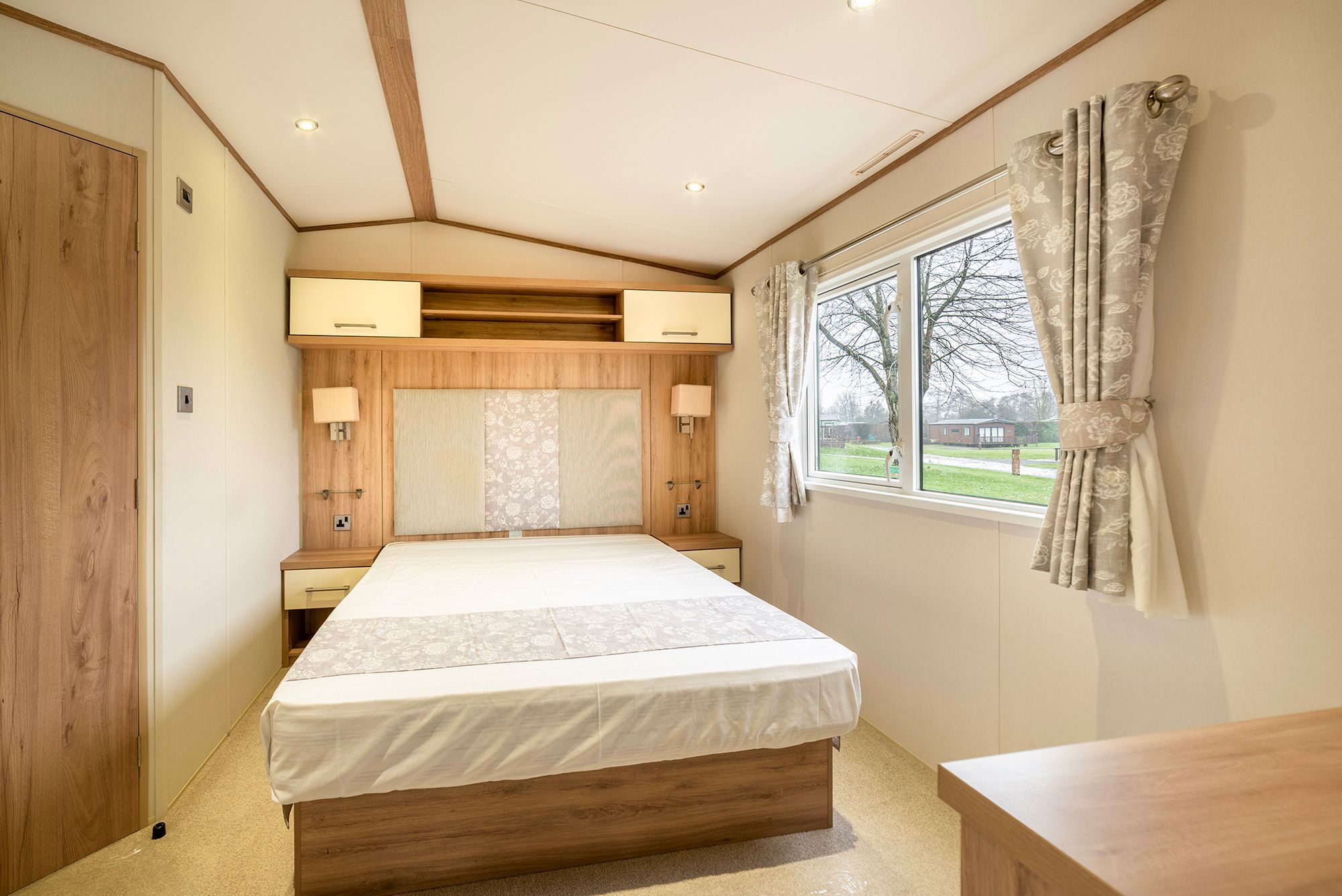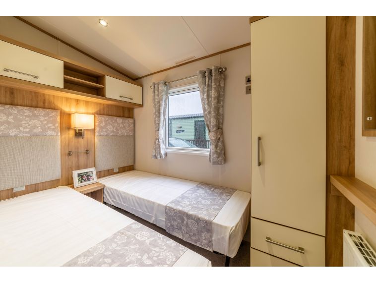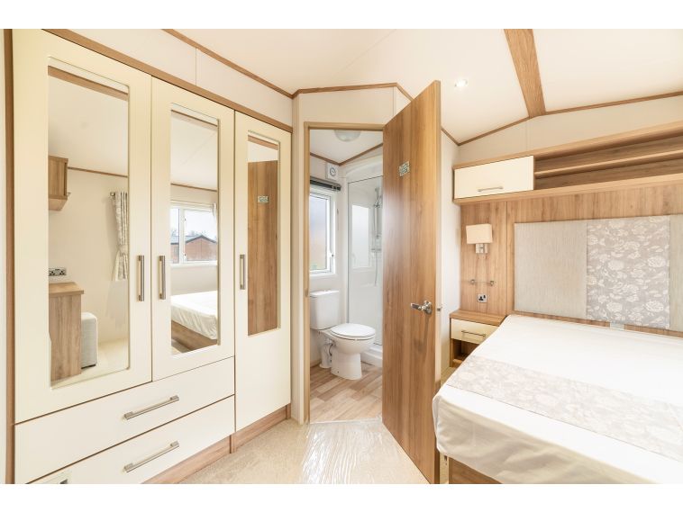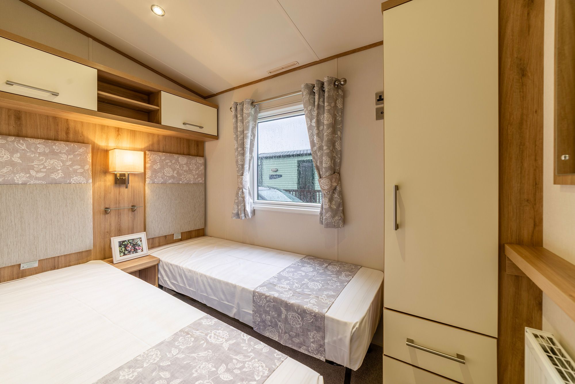 At the end of the Hereford are the bedrooms and bathrooms. The generous twin bedded room has a slimline wardrobe and plenty of storage. This is served by the family shower room with double shower, bags of storage, and opening obscured window.