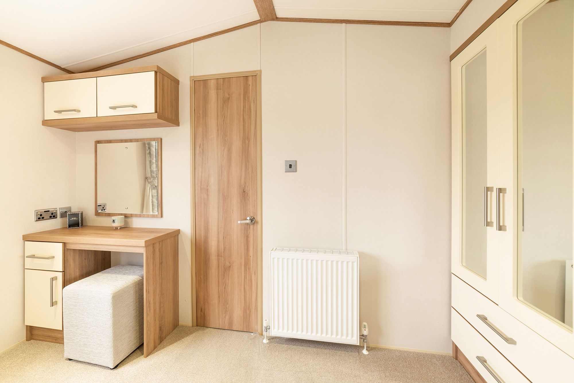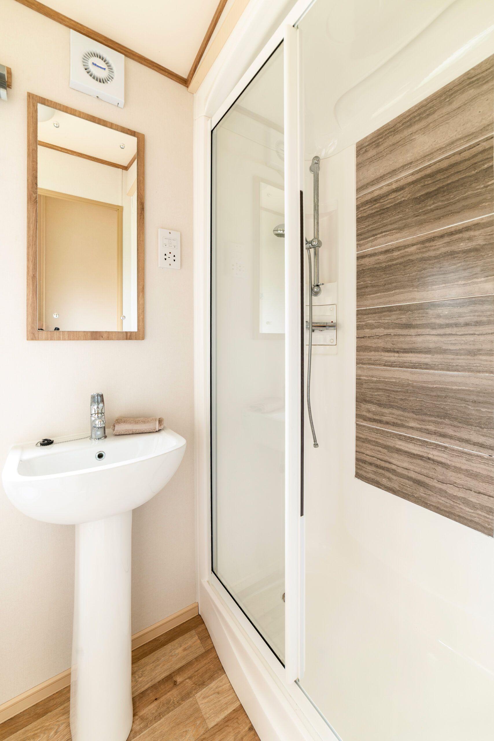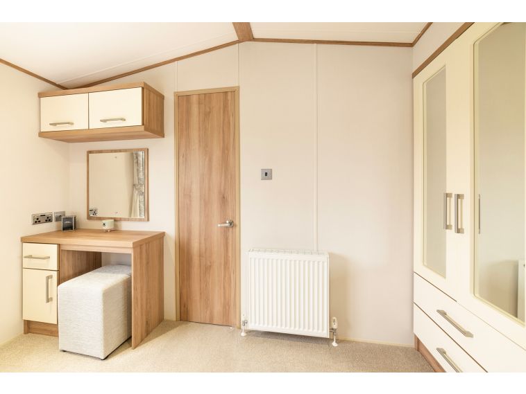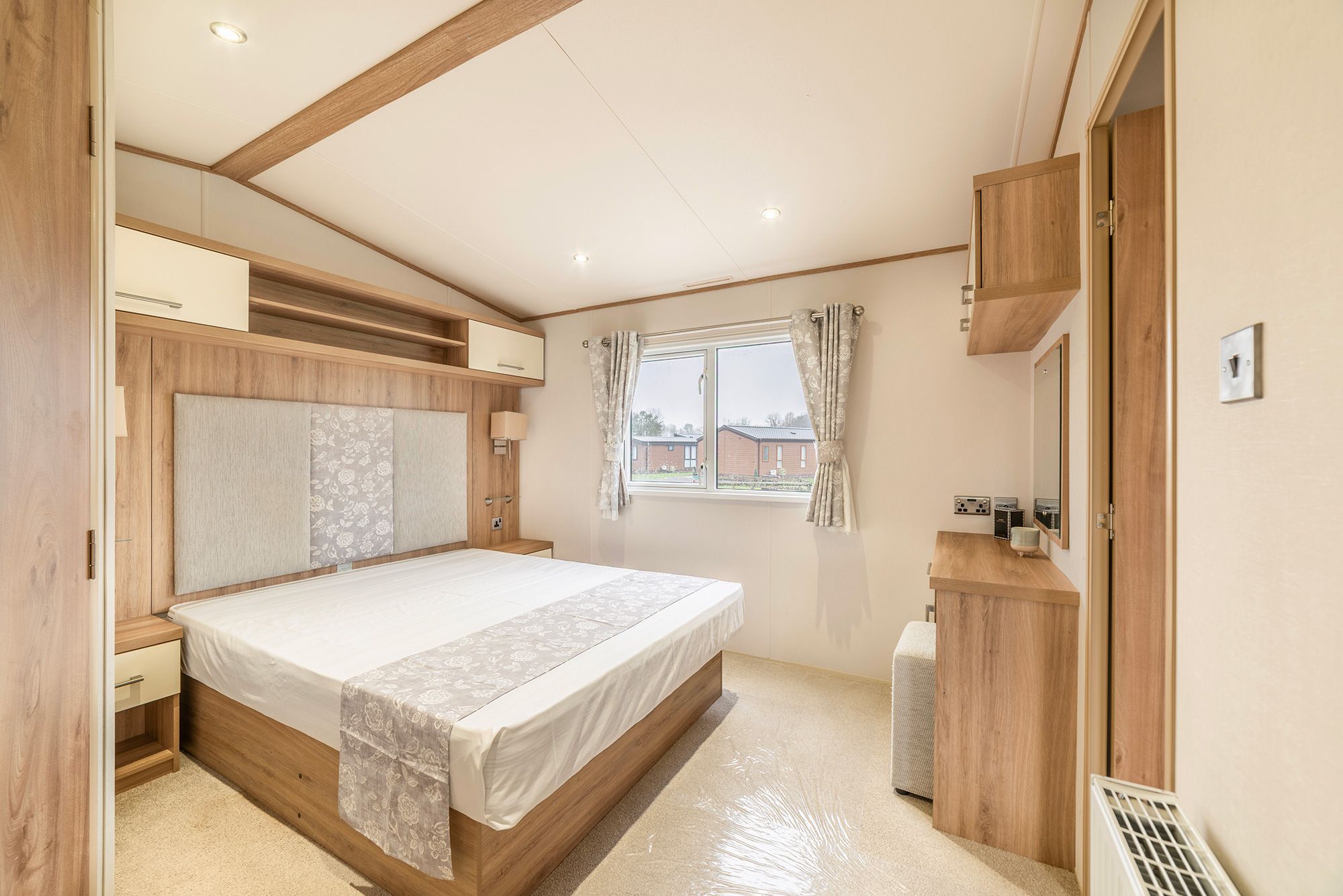 At the end of the Hereford are the bedrooms and bathrooms. The generous twin bedded room has a slimline wardrobe and plenty of storage. This is served by the family shower room with double shower, bags of storage, and opening obscured window.
