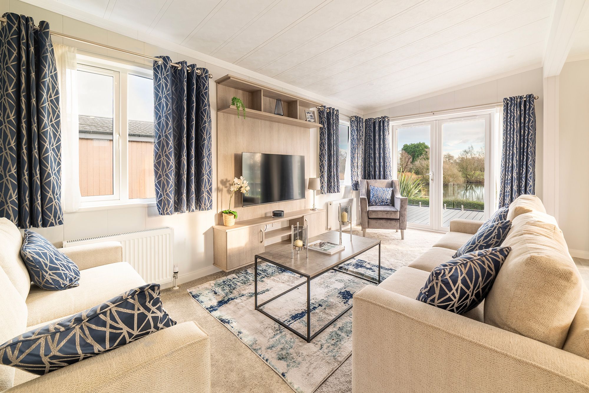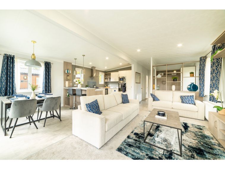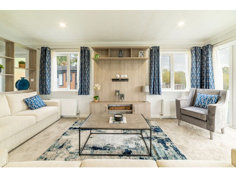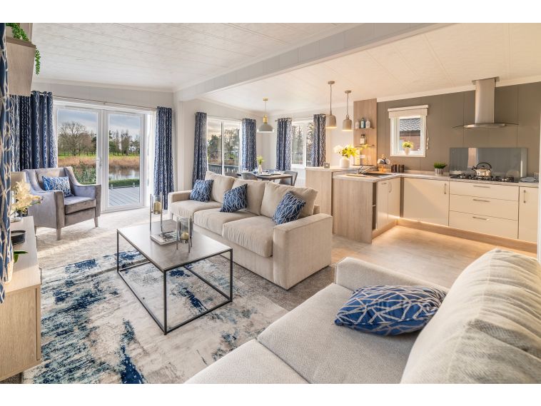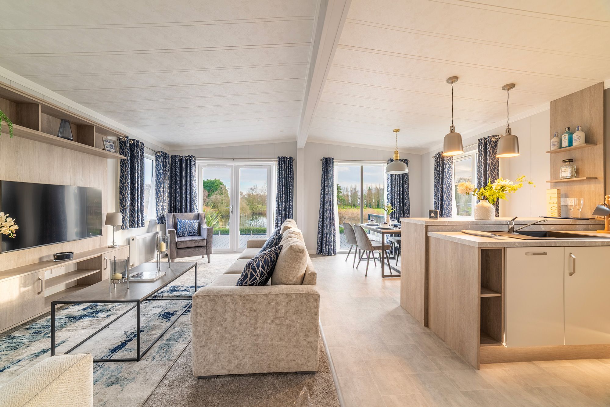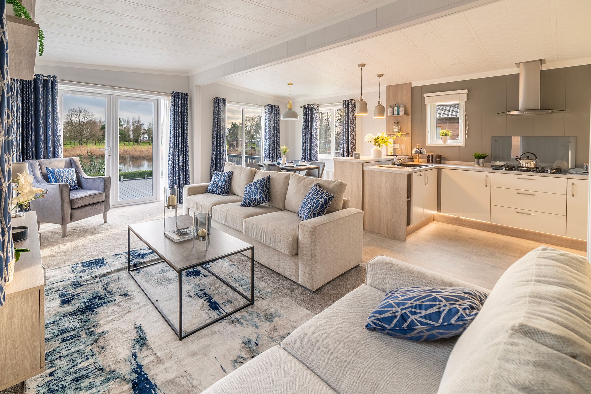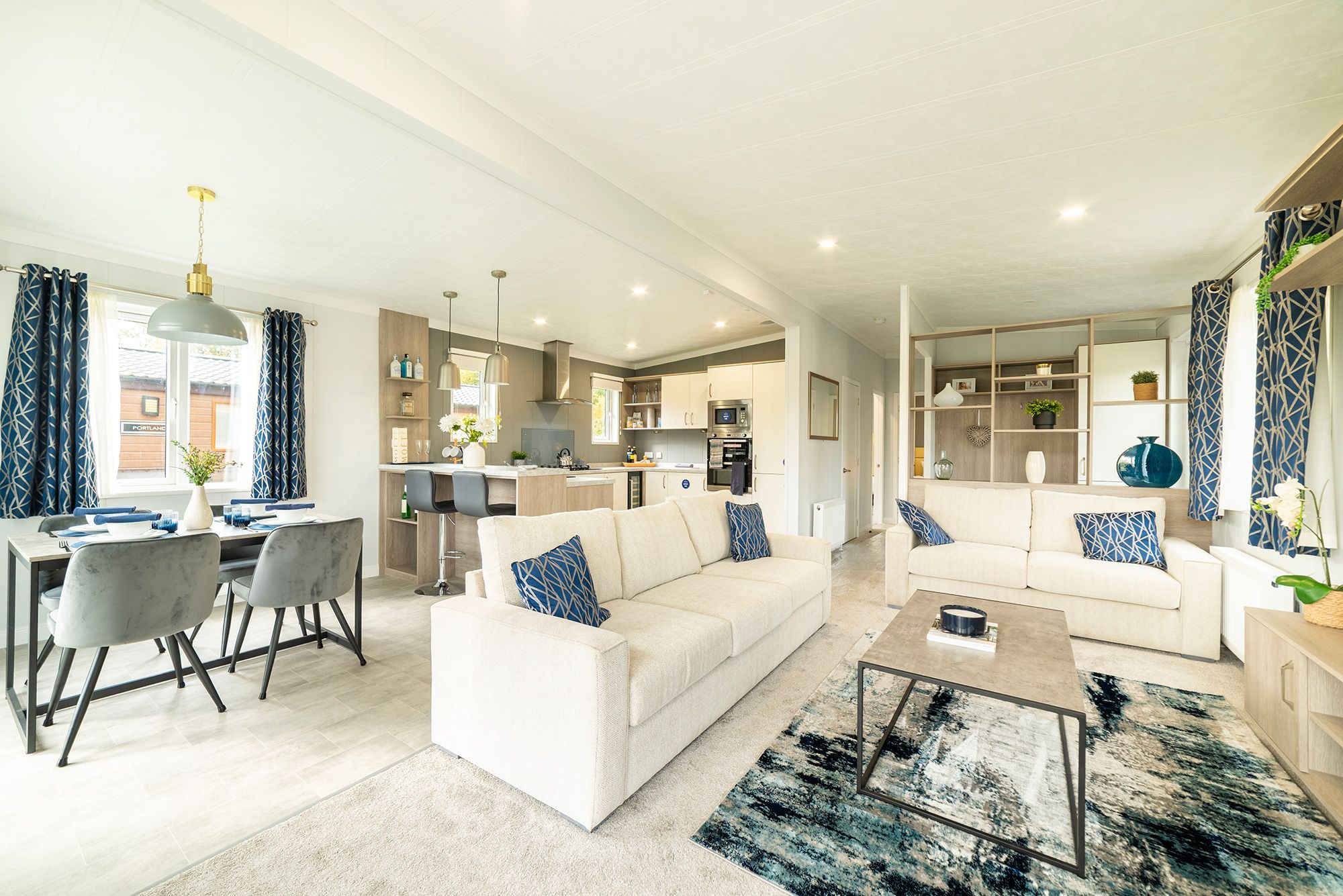 The Skydale is a double width lodge so there’s bags of internal space which feels light and airy from front to back. The colour palette is calming greys, blues and creams, which gives you a feeling of peacefulness.