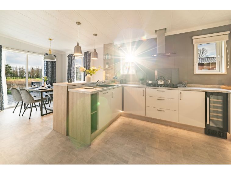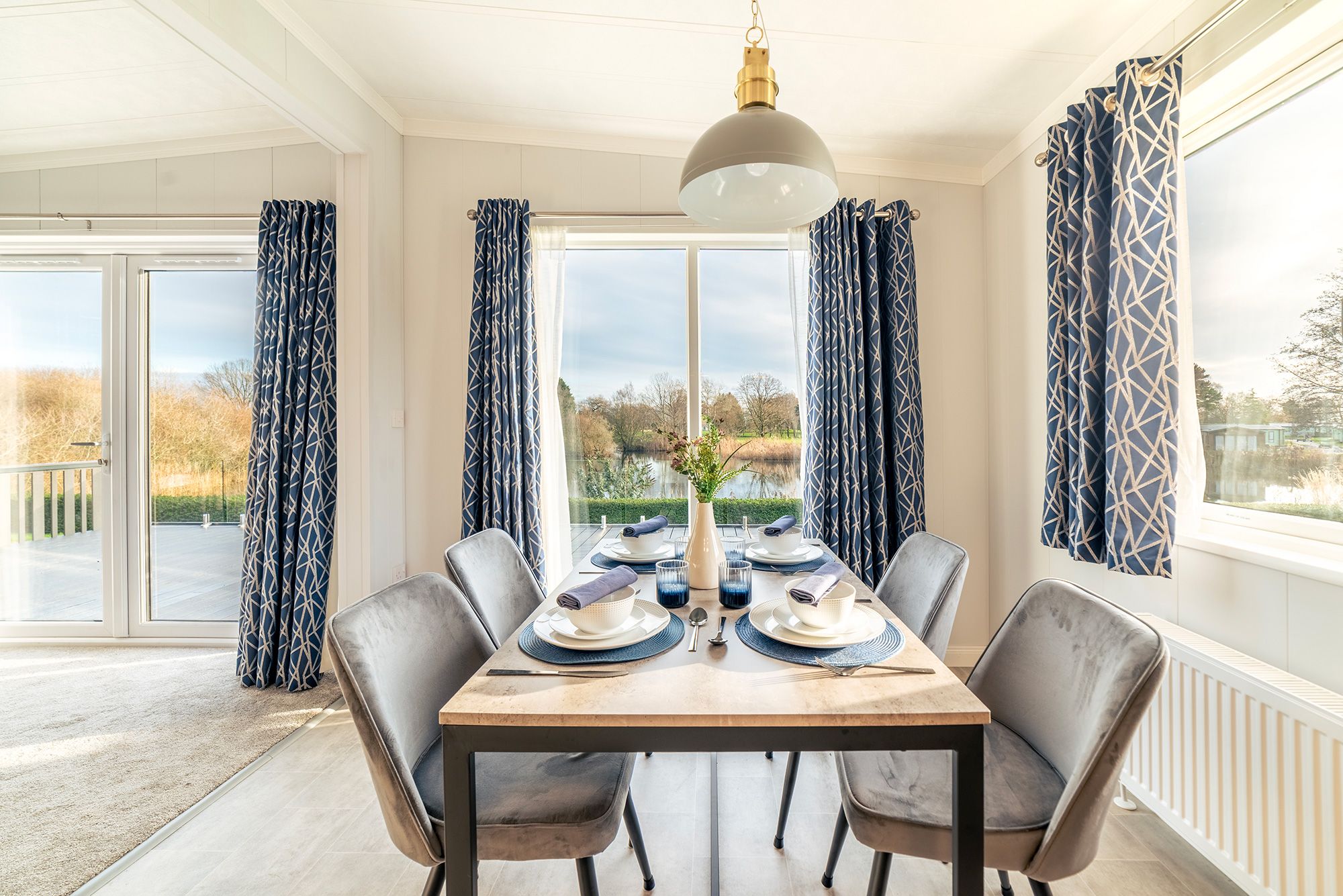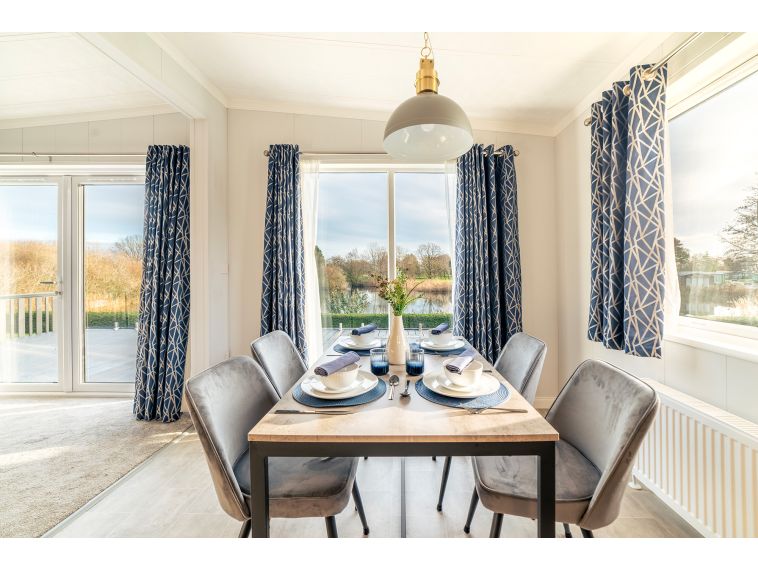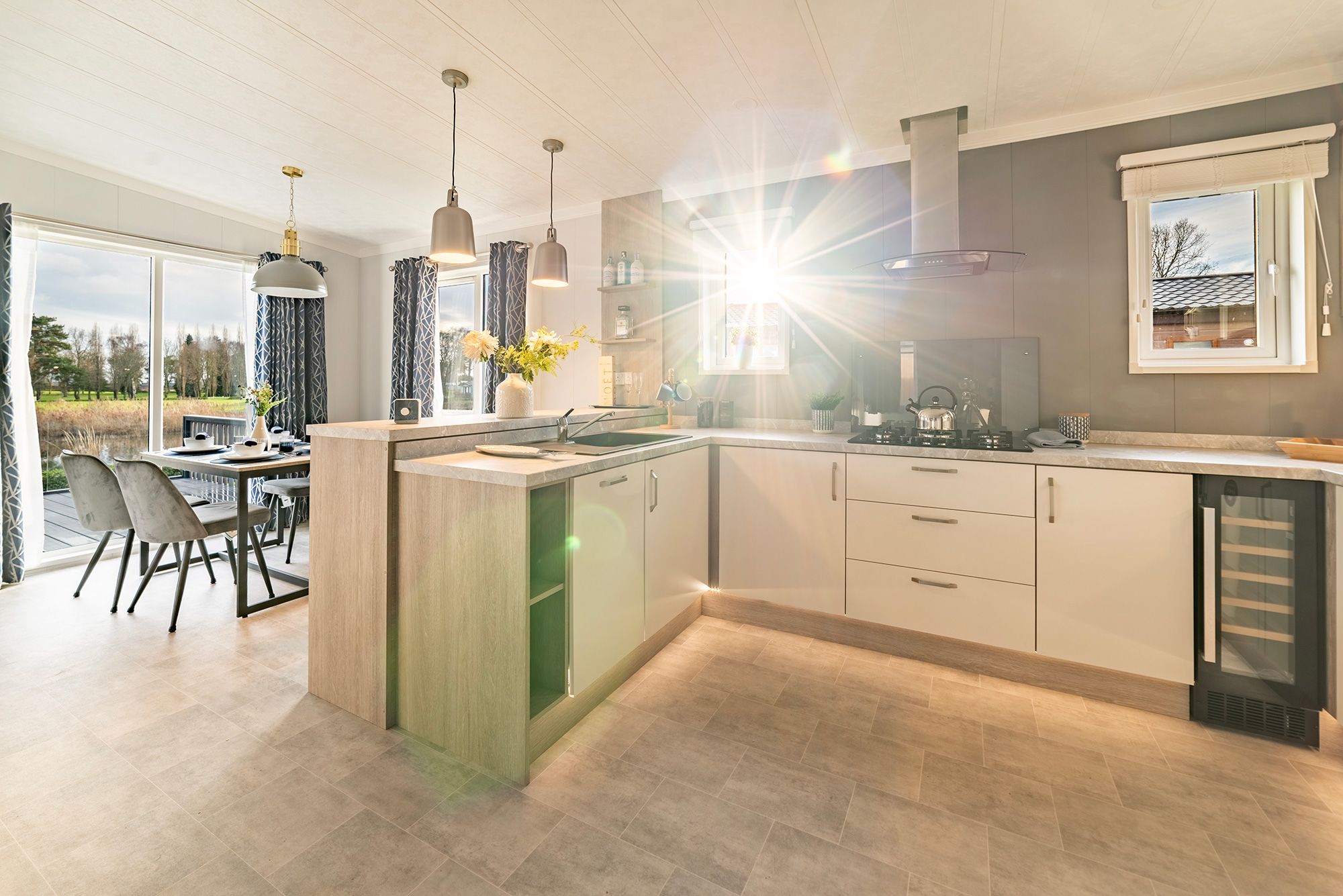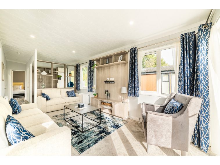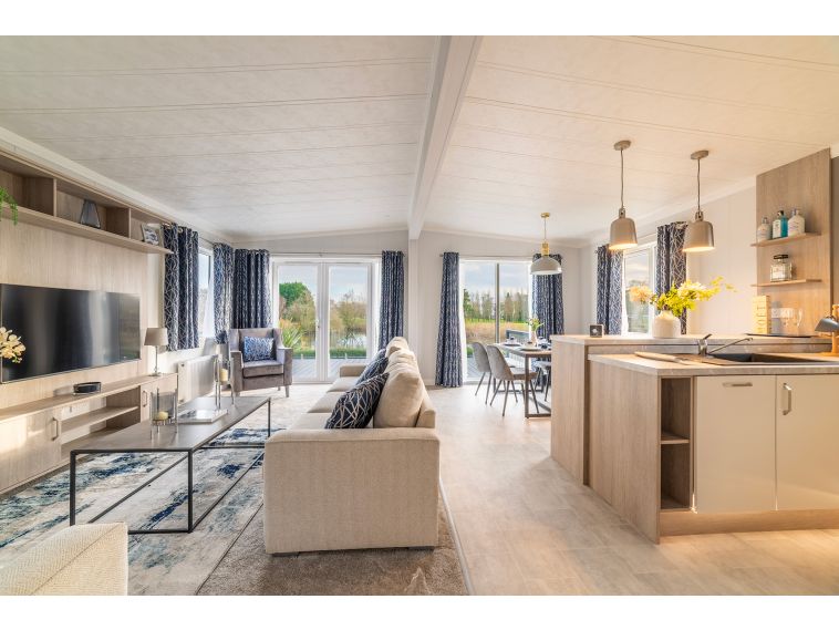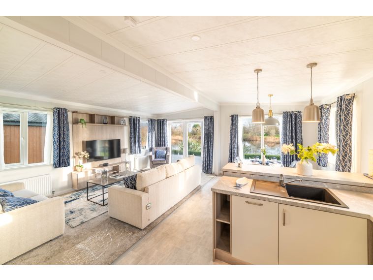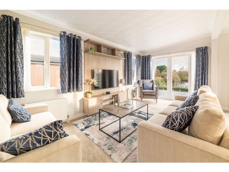 The Skydale is a double width lodge so there’s bags of internal space which feels light and airy from front to back. The colour palette is calming greys, blues and creams, which gives you a feeling of peacefulness.