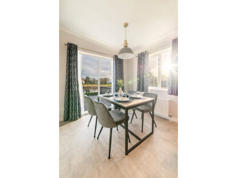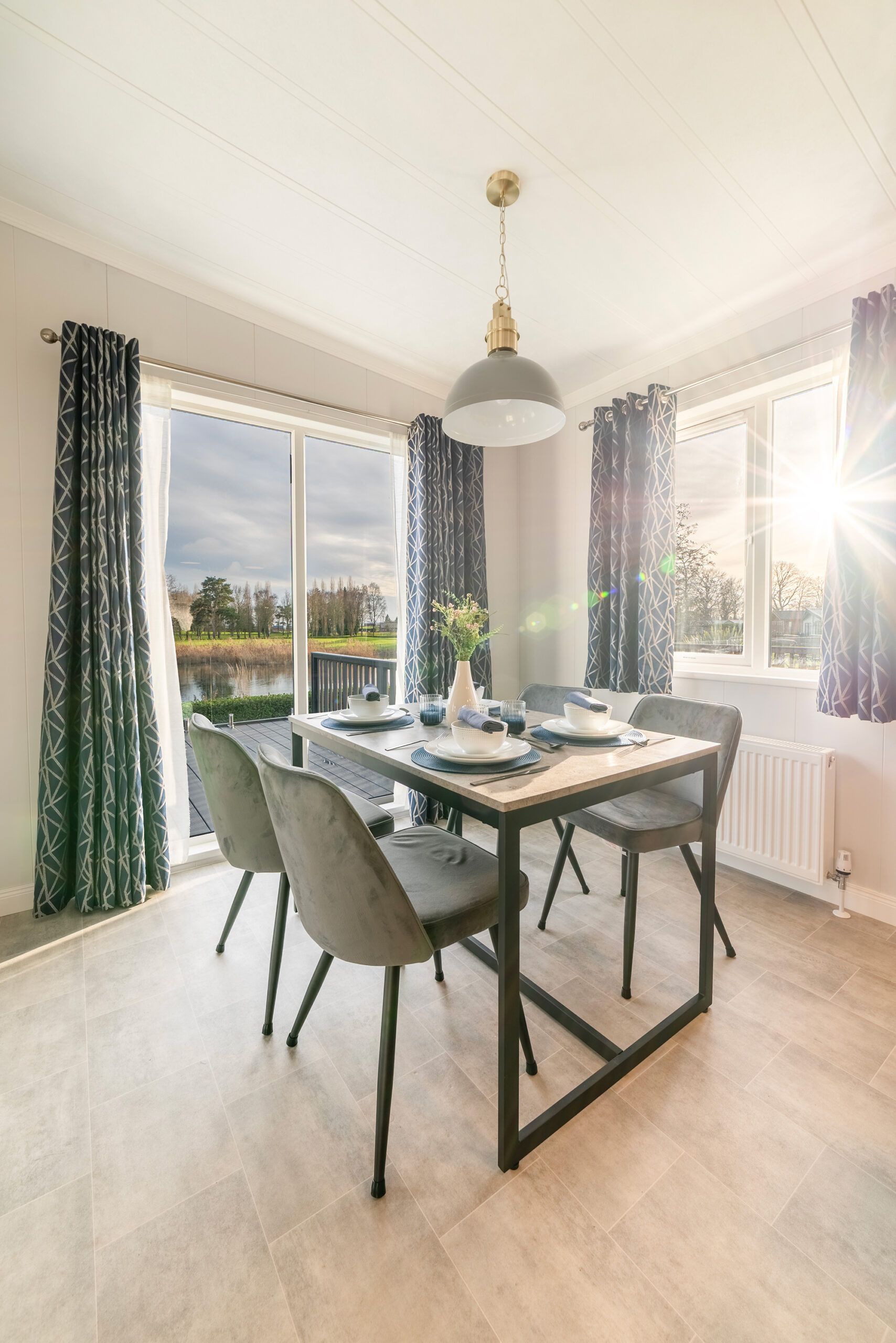 Beyond the kitchen is the impressive lounge/dining space. With two sets of patio doors taking you onto the decking, you’ll have the sun rising over the pool as you’re tucking into your cornflakes. The dining table with 4 chairs (but you could easily seat 6) is in its own space giving this living area clear demarcations.