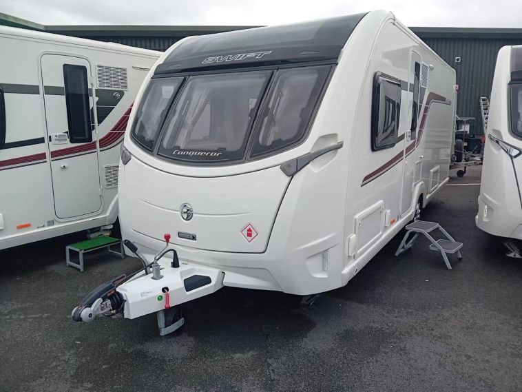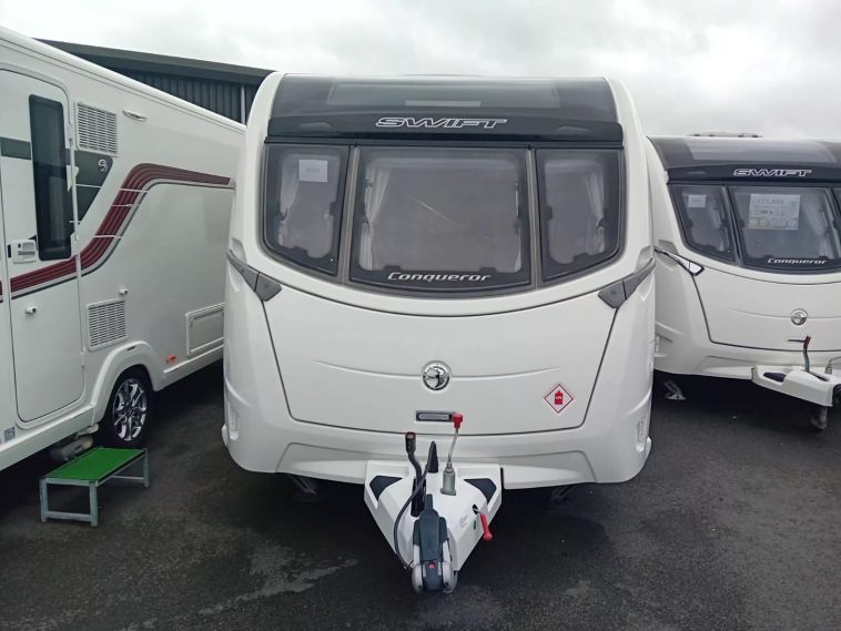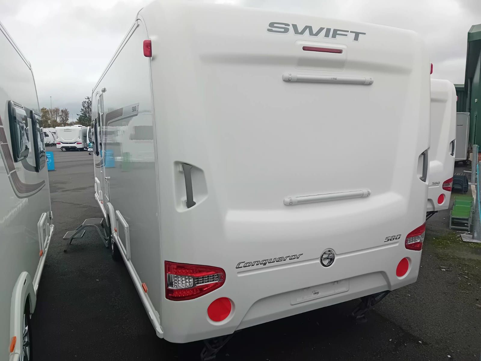 The 2016 Swift Conqueror 580 is a 4-berth touring caravan, offering a premium touring experience with high-quality construction. Available now at Salop Leisure in Shrewsbury, this model features a spacious transverse island bed, a full-width end washroom, and ALDE wet heating for year-round comfort.