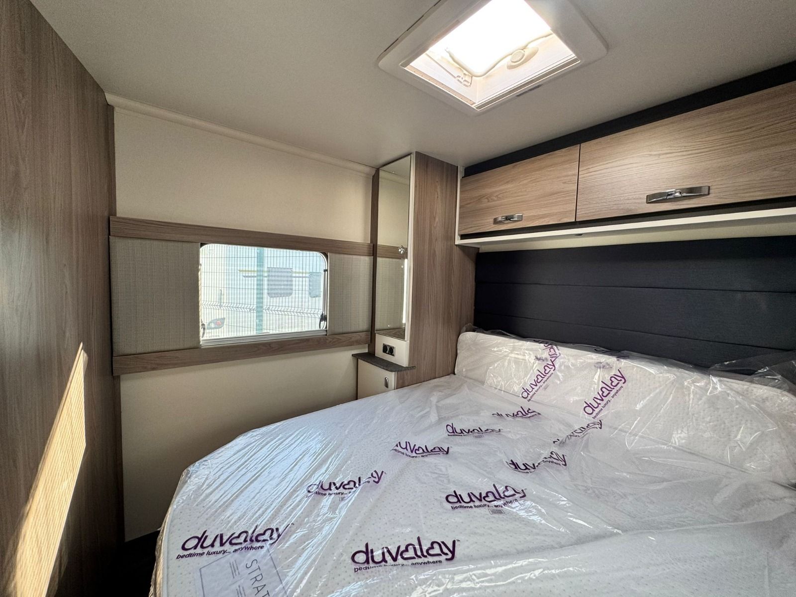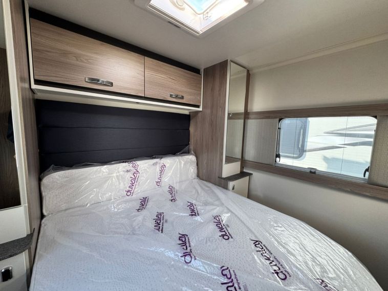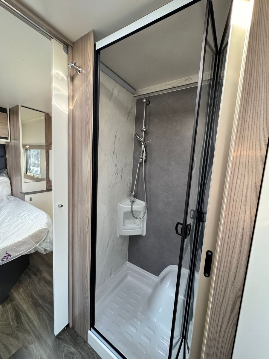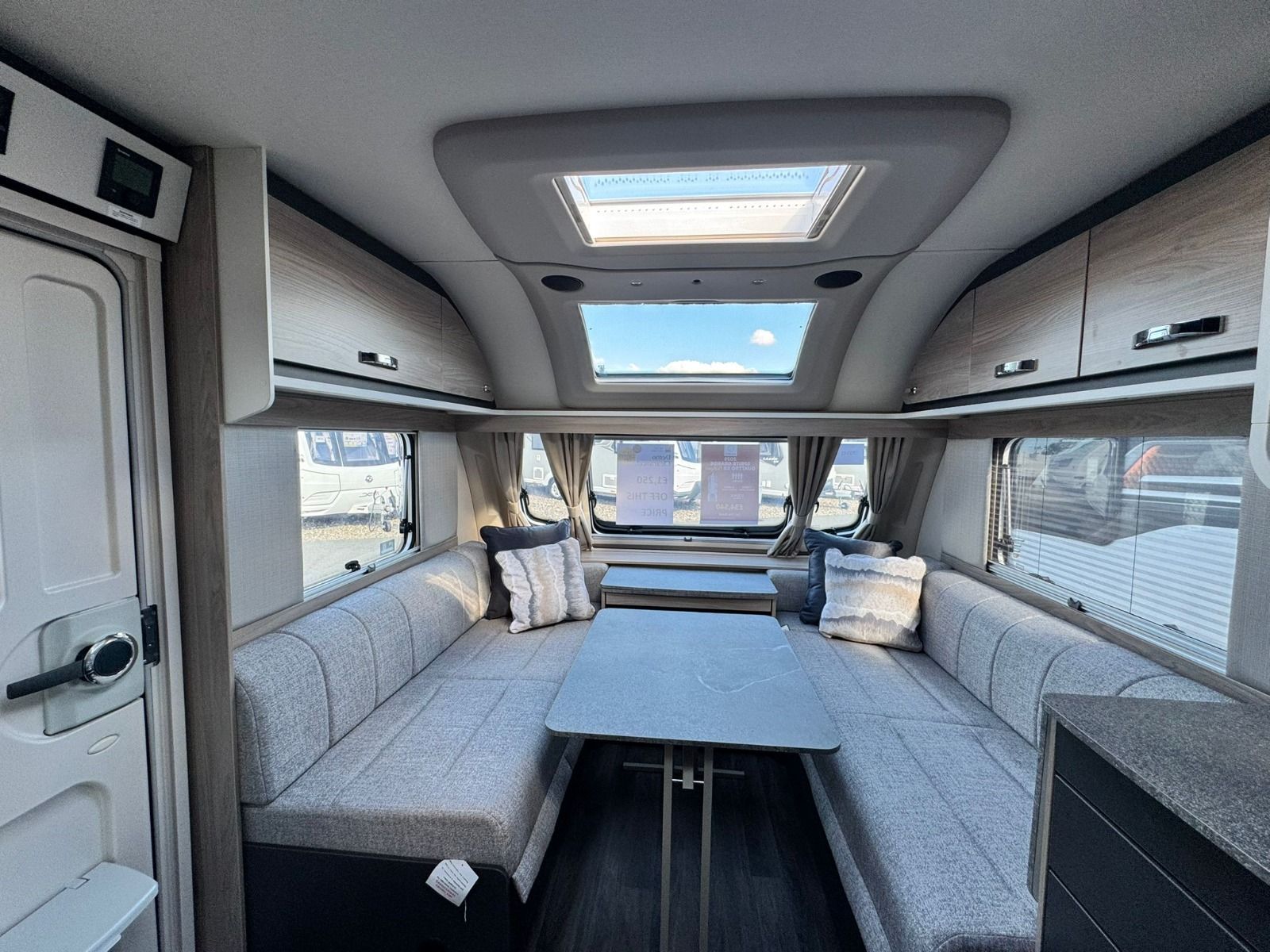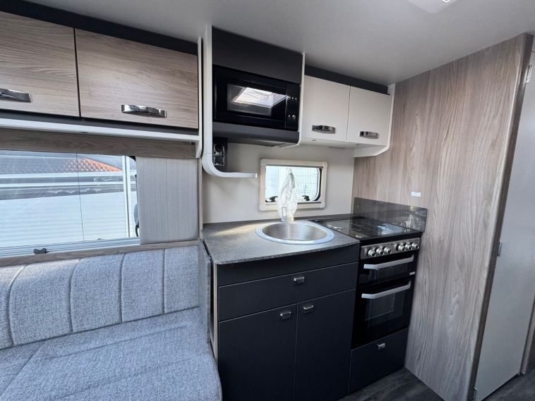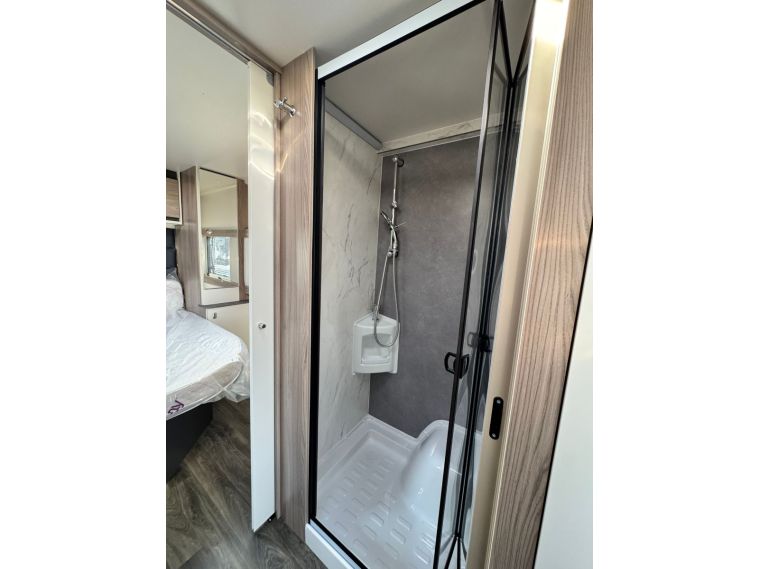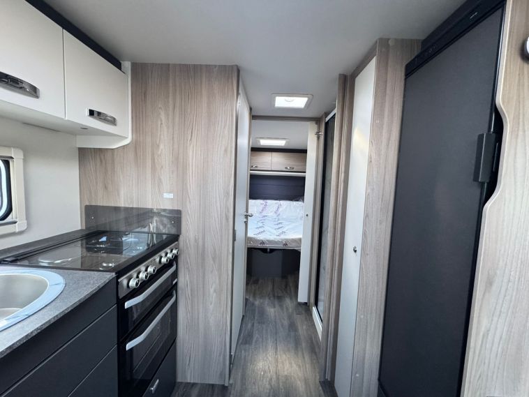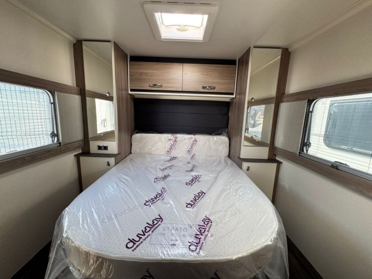 A twin-axle, 8ft-wide luxury touring caravan designed for space, comfort, and modern convenience.