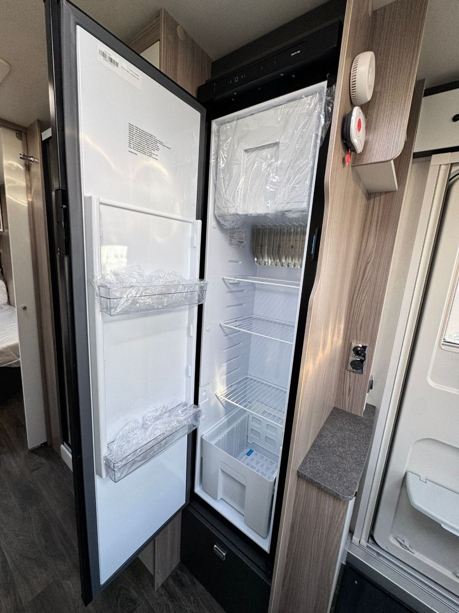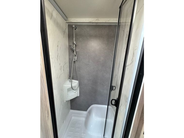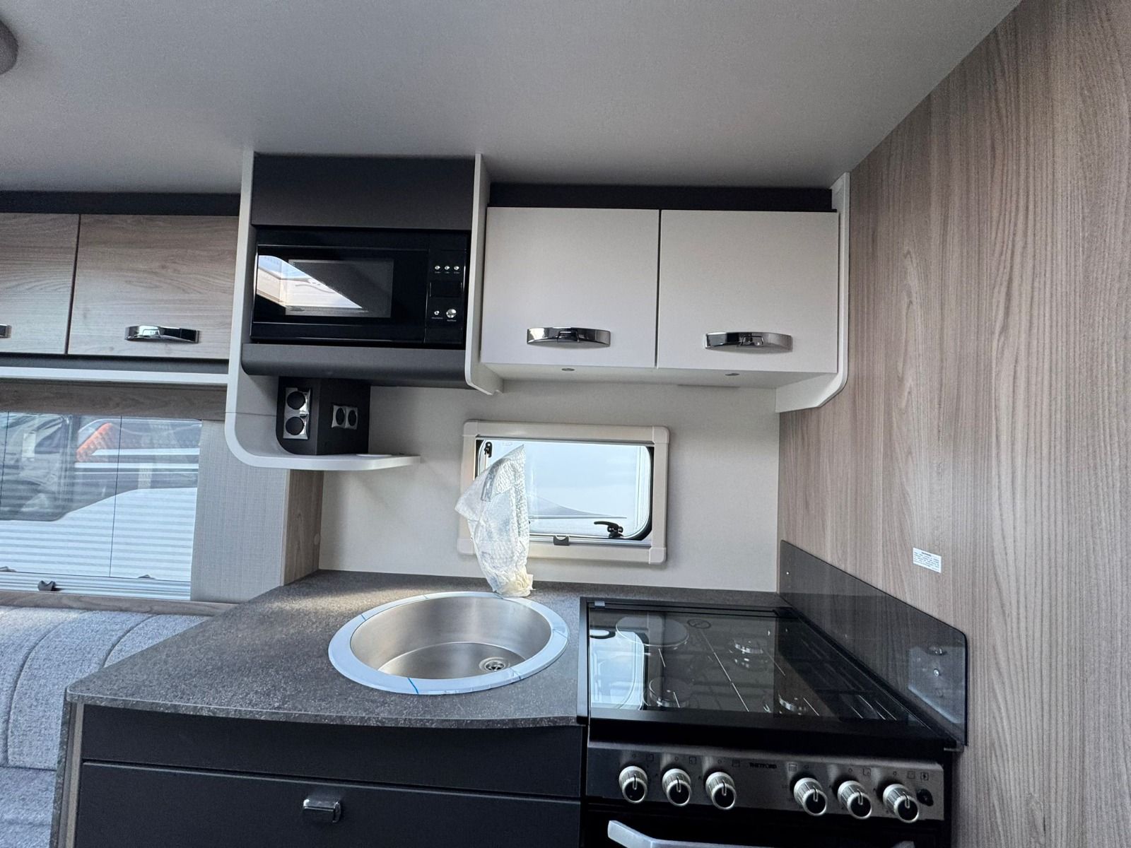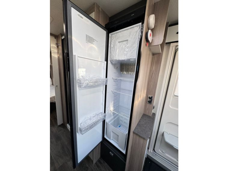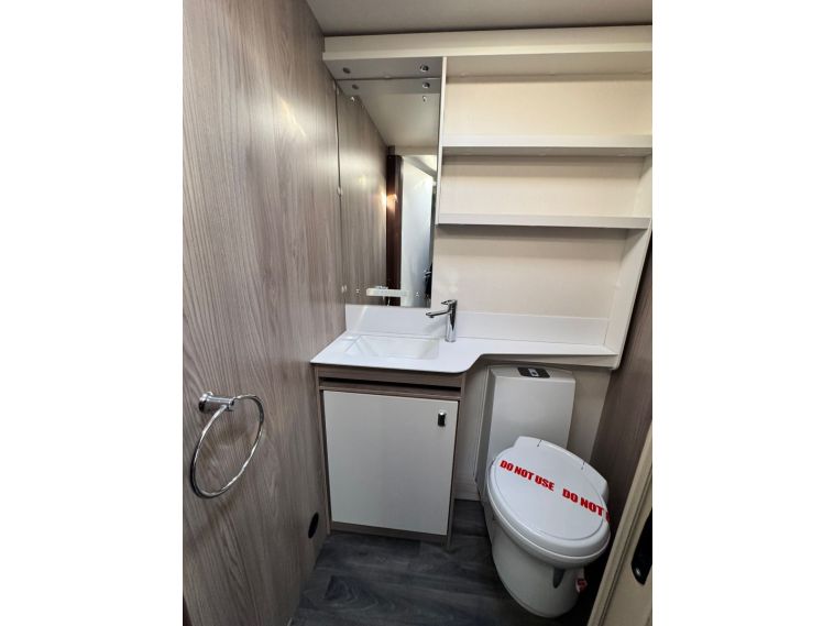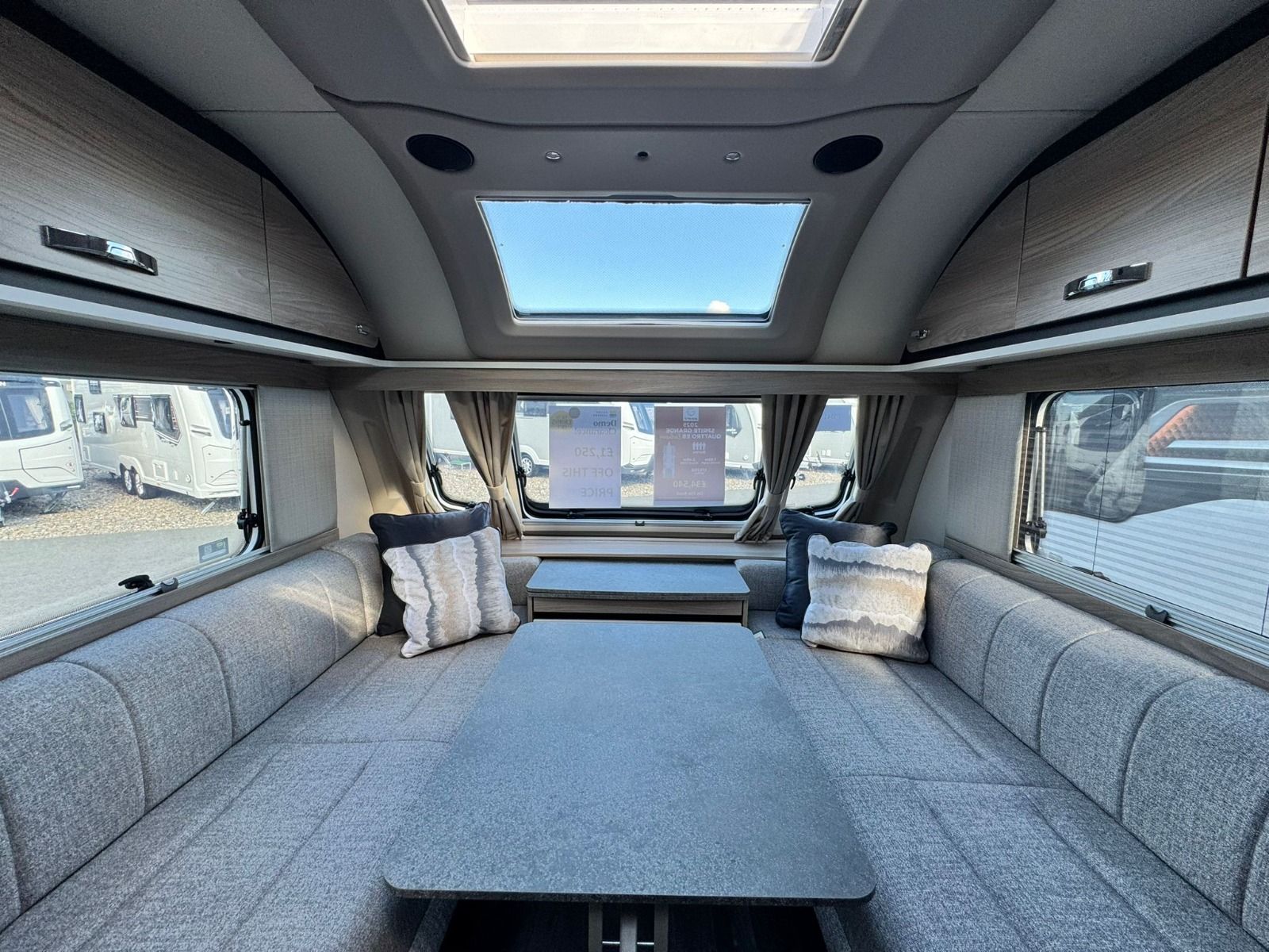 A twin-axle, 8ft-wide luxury touring caravan designed for space, comfort, and modern convenience.