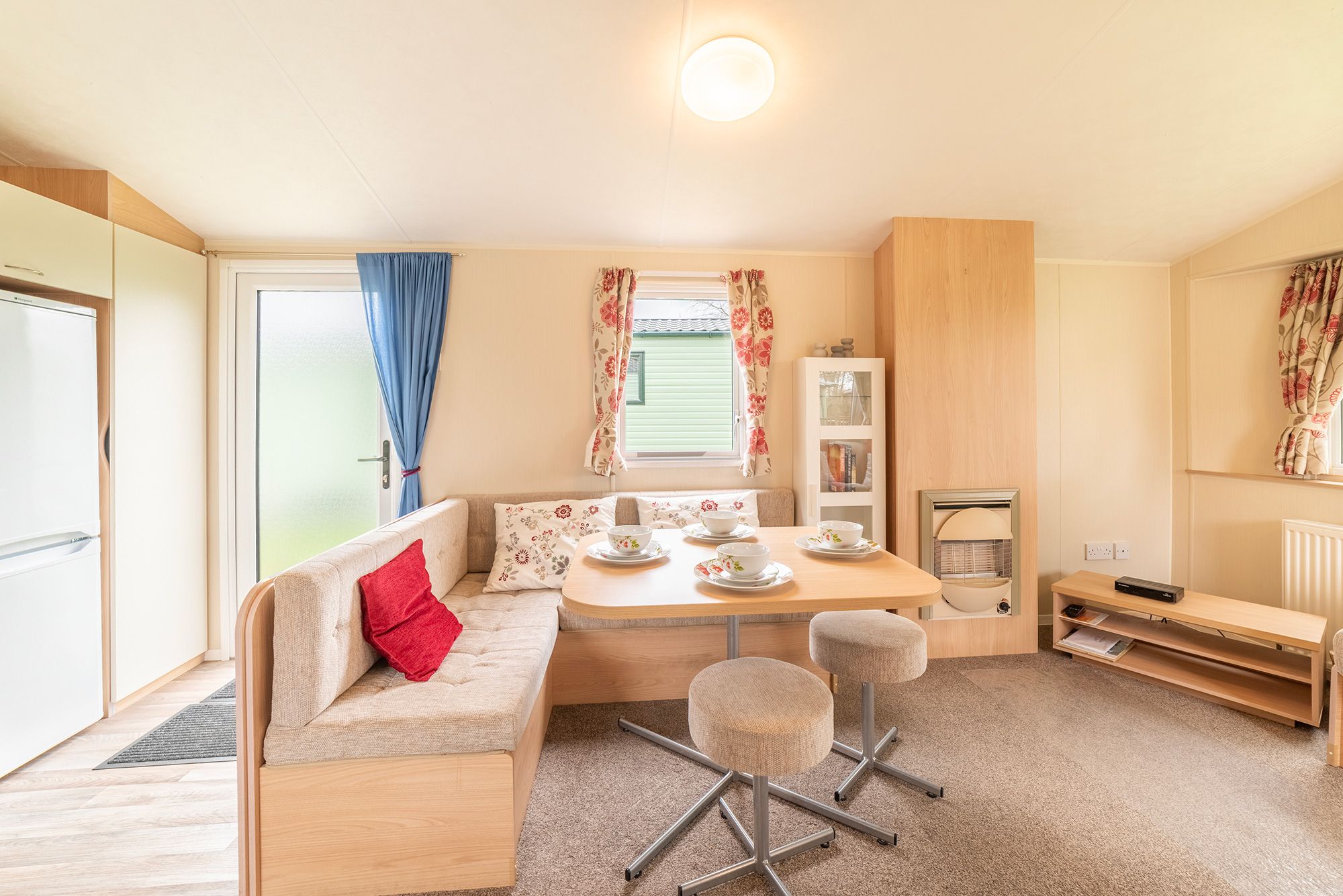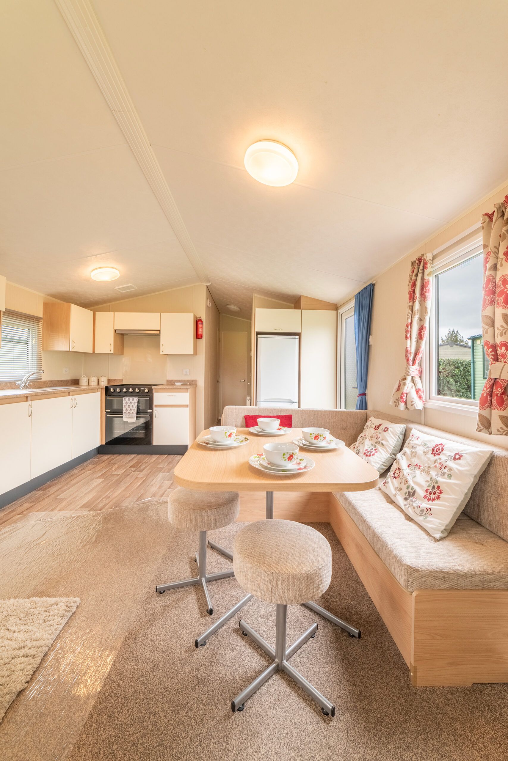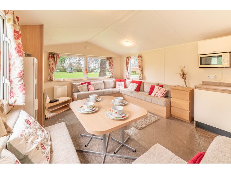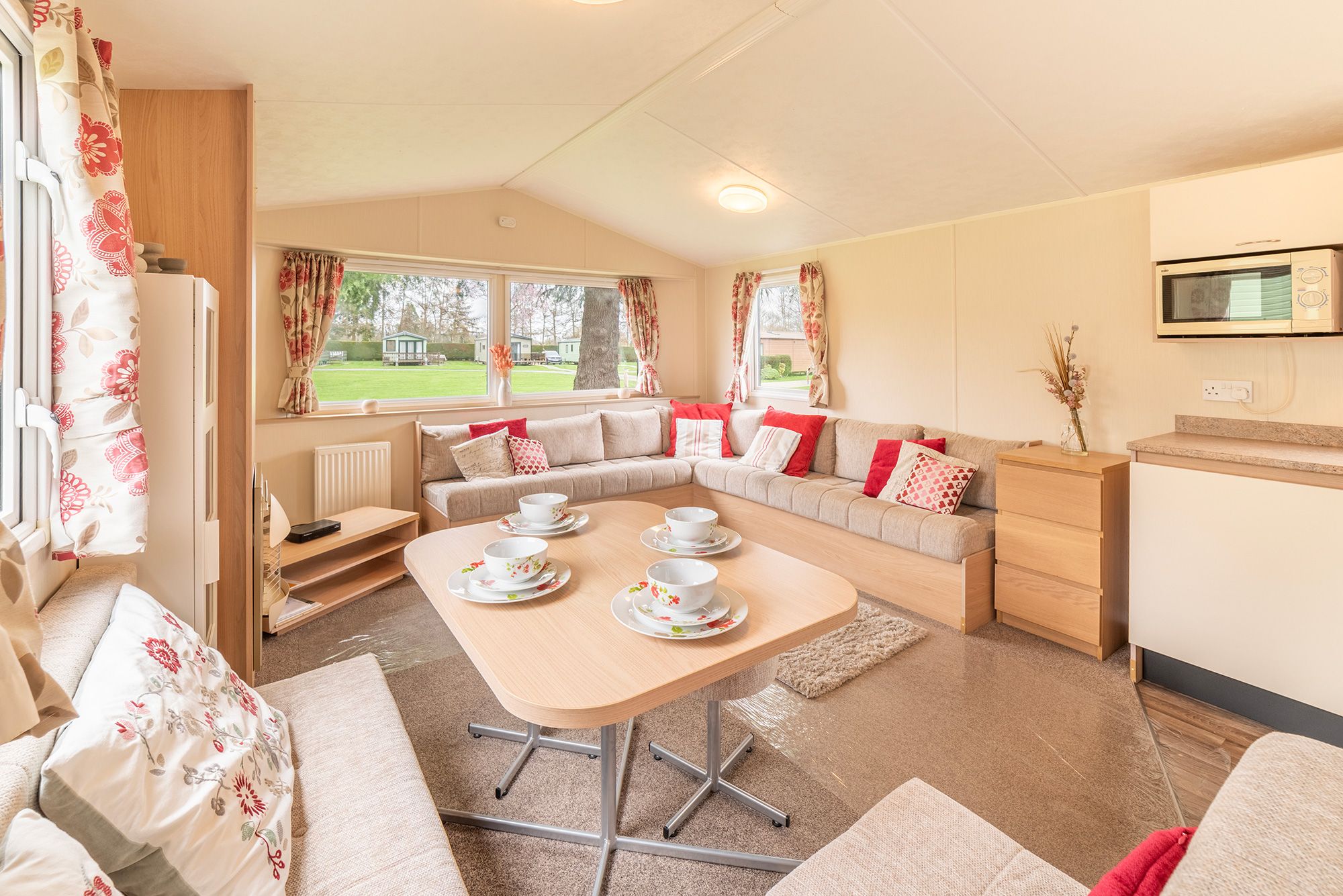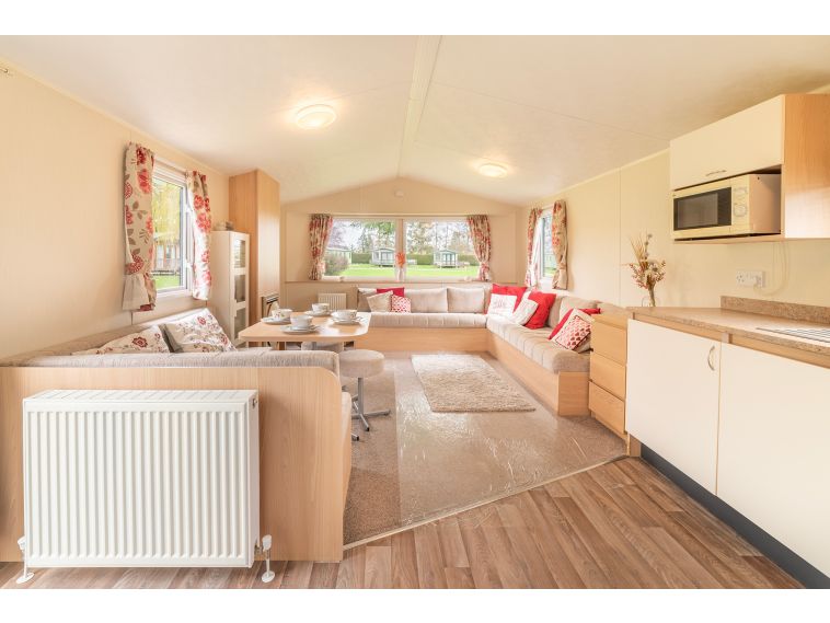 In the lounge area, the large l-shaped sofa is a real feature. It seats at least 6 and includes a sofa bed for extra guests. There are lovely views from the front window as the Aurora is on a particularly spacious plot. Situated on the Willow area of Arrow Bank, there’s a large open grass area to the front with a well-established tree.