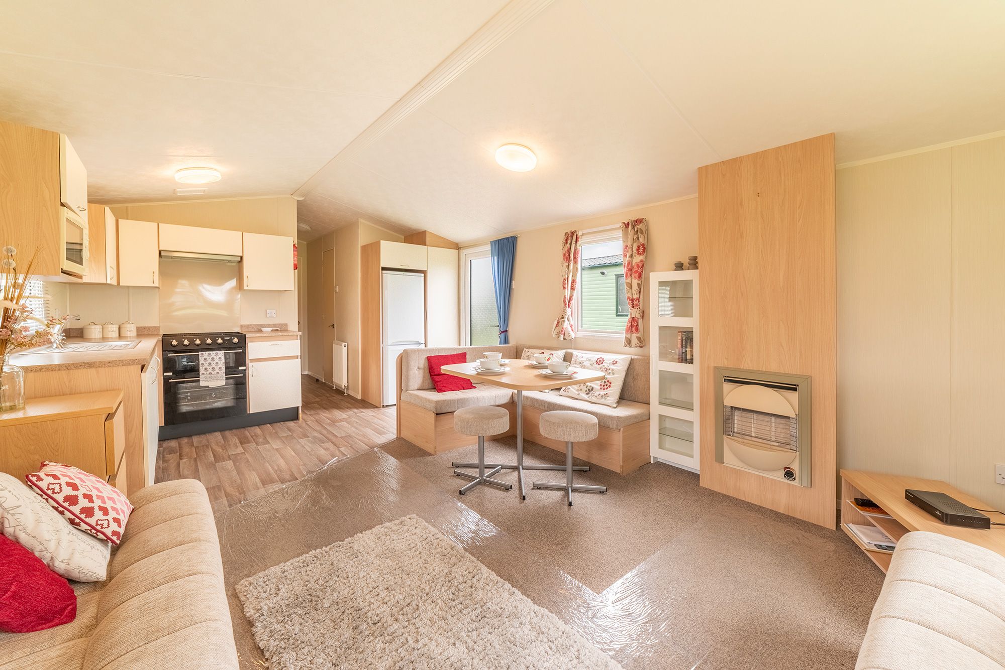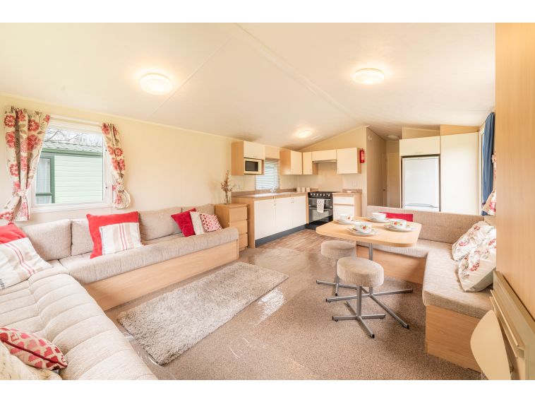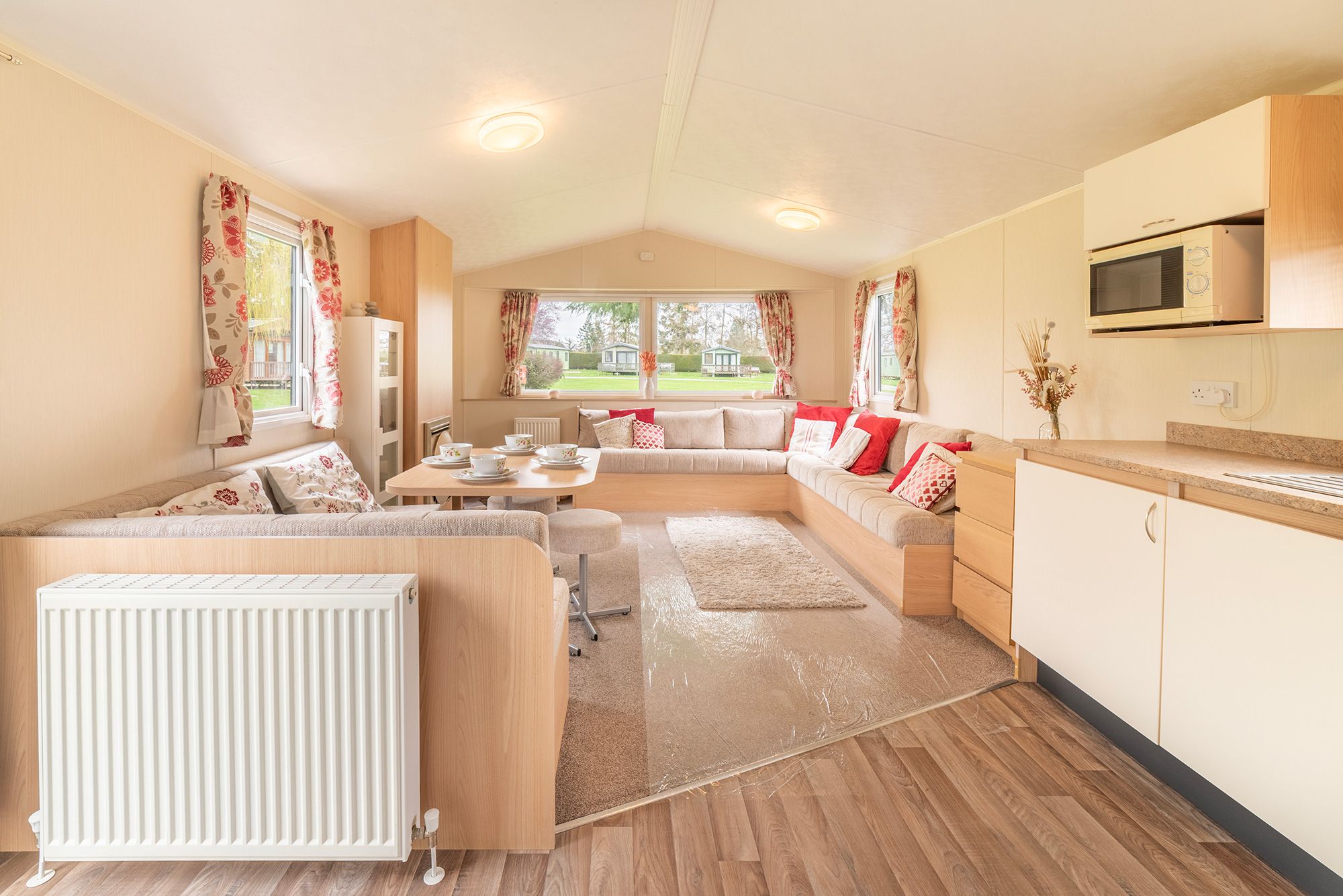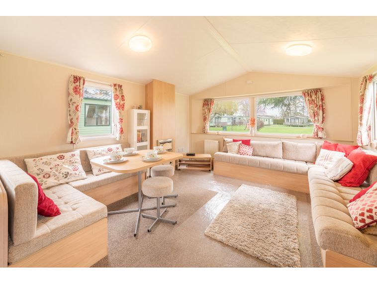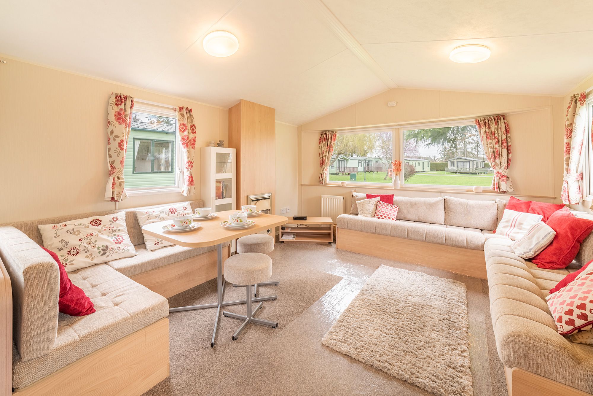 In the lounge area, the large l-shaped sofa is a real feature. It seats at least 6 and includes a sofa bed for extra guests. There are lovely views from the front window as the Aurora is on a particularly spacious plot. Situated on the Willow area of Arrow Bank, there’s a large open grass area to the front with a well-established tree.