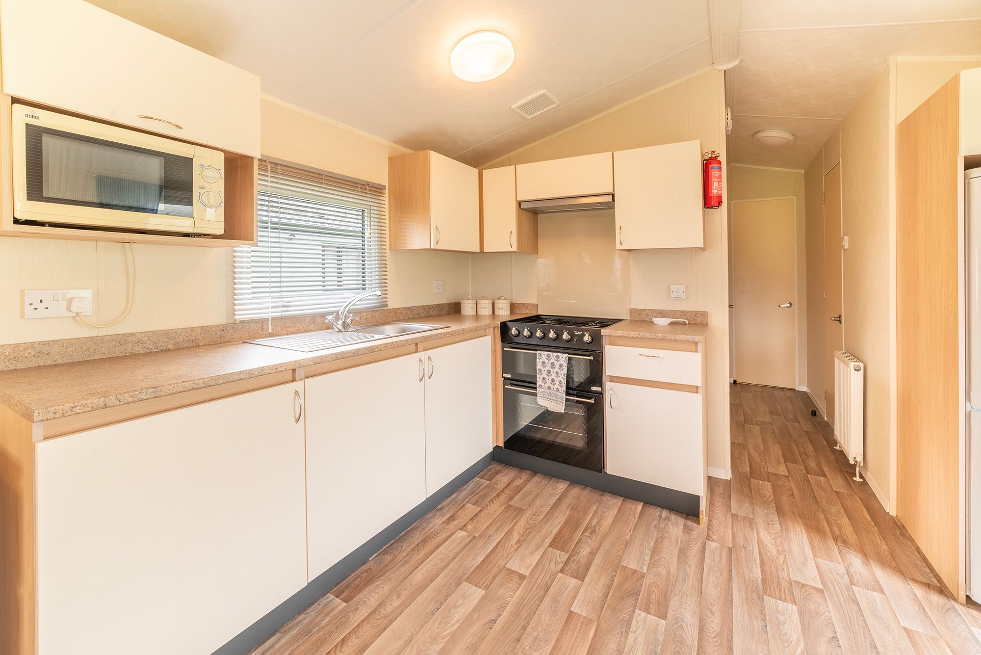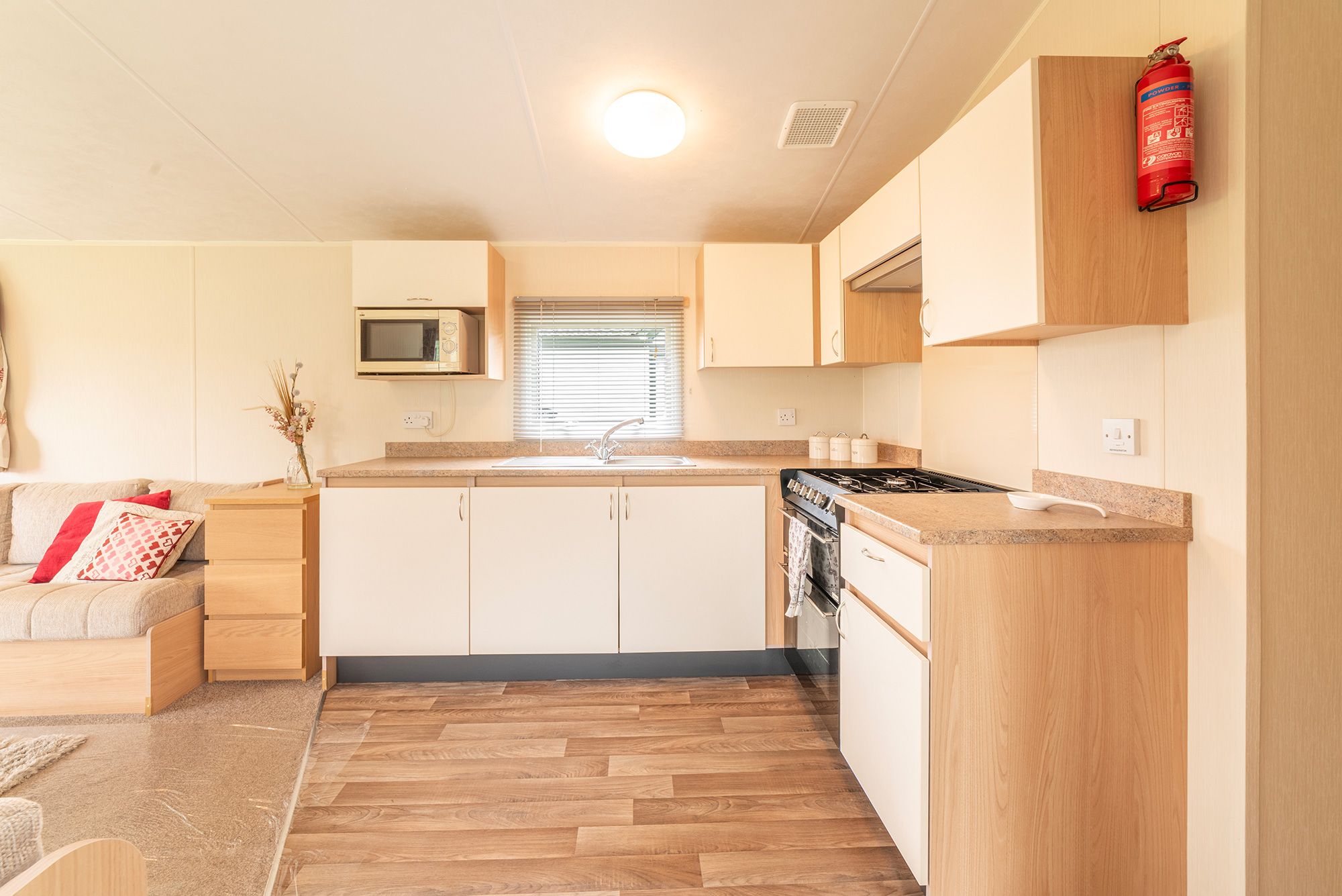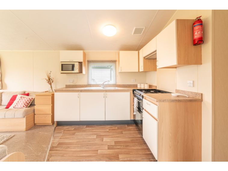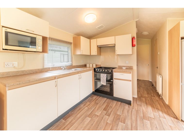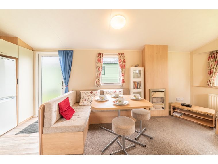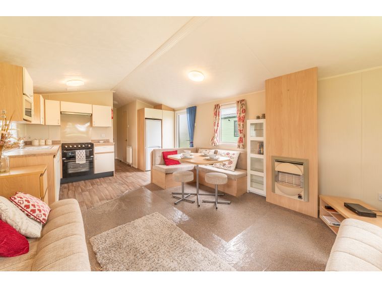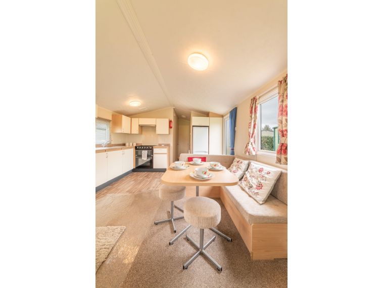 In the lounge area, the large l-shaped sofa is a real feature. It seats at least 6 and includes a sofa bed for extra guests. There are lovely views from the front window as the Aurora is on a particularly spacious plot. Situated on the Willow area of Arrow Bank, there’s a large open grass area to the front with a well-established tree.