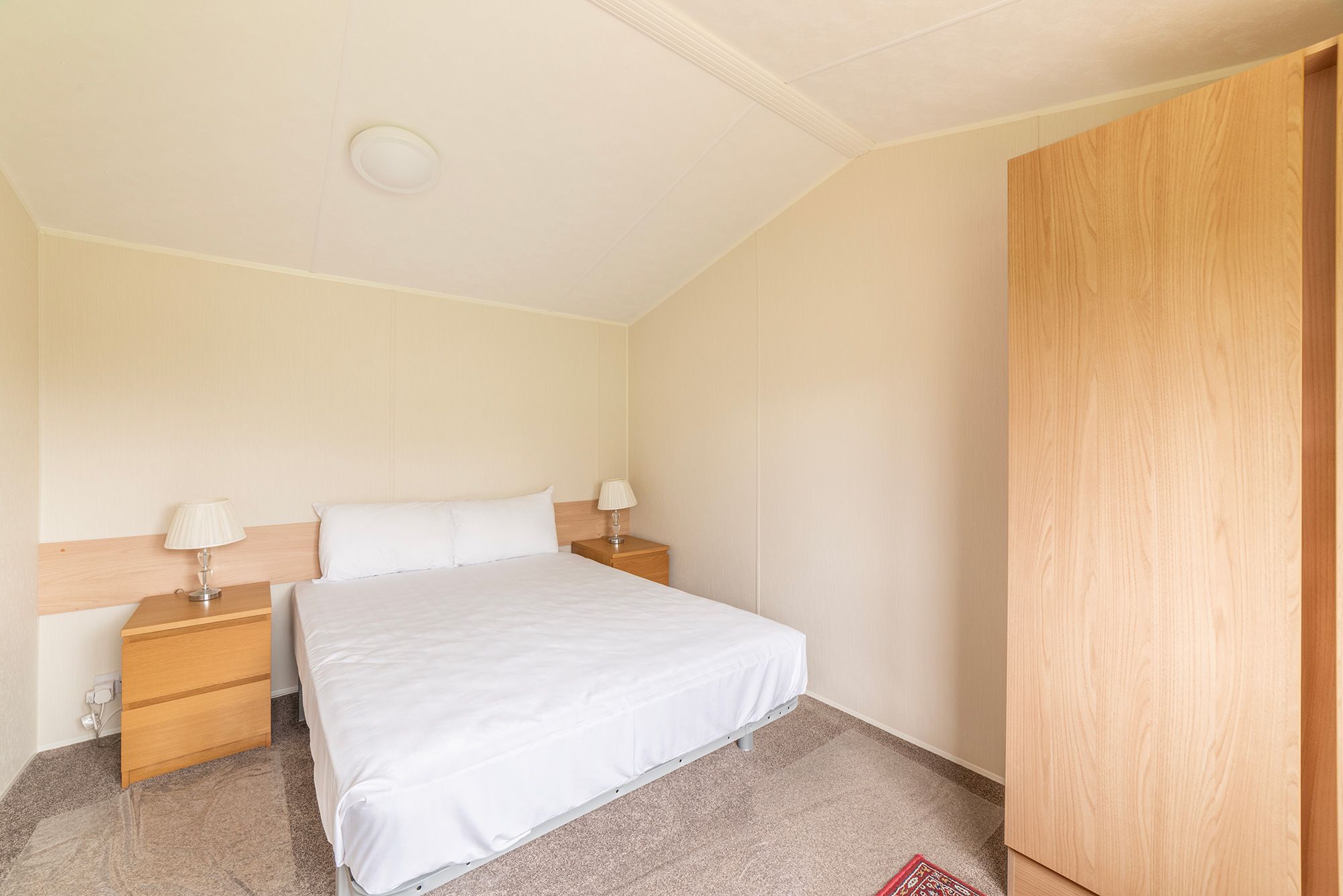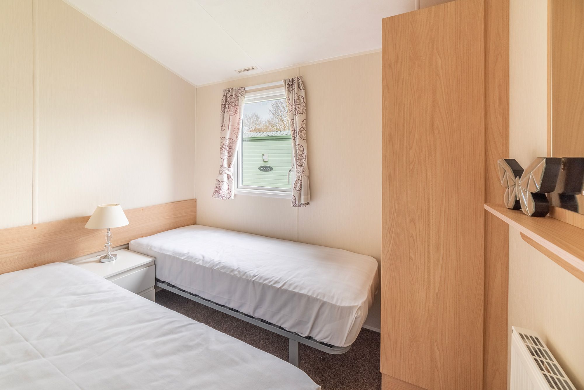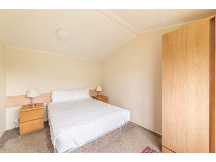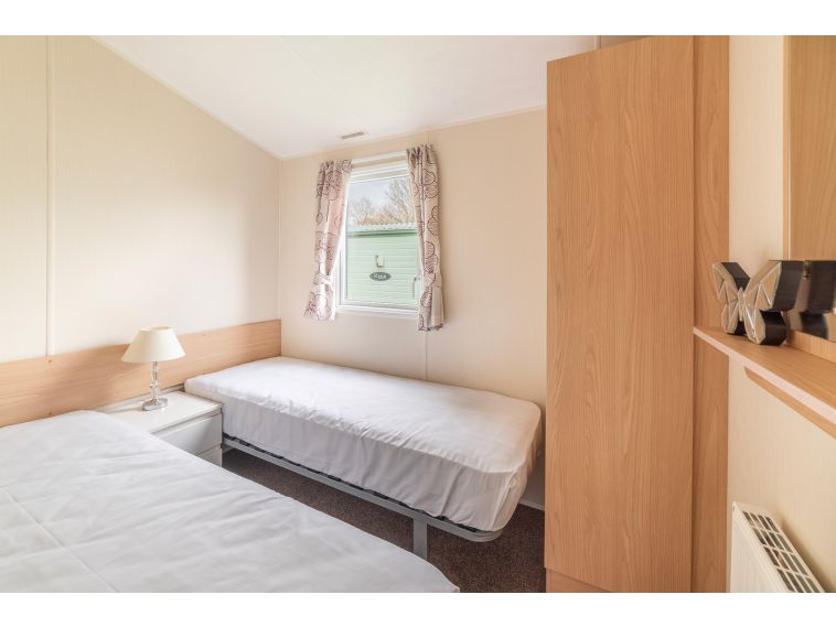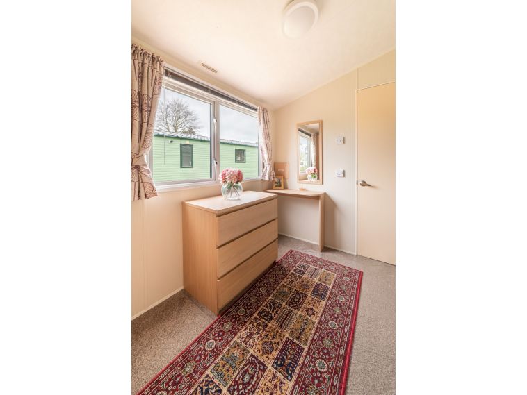 The family bathroom has a clean white suite with opening window. Opposite is a twin bedroom. Both beds have push under storage plus there’s also a small wardrobe and bedside table. At the end of the home is the master bedroom with a double bed, freestanding wardrobe, large chest of drawers and a handy dressing table with mirror.