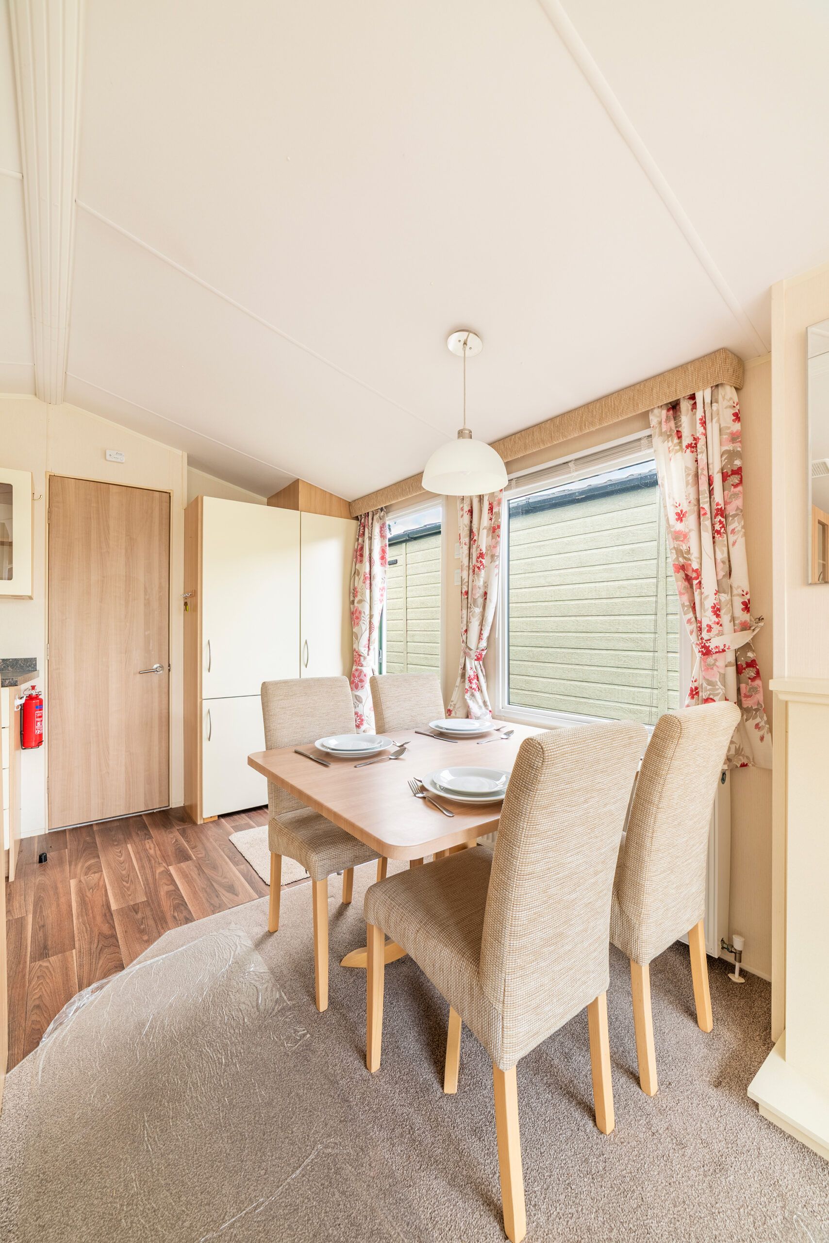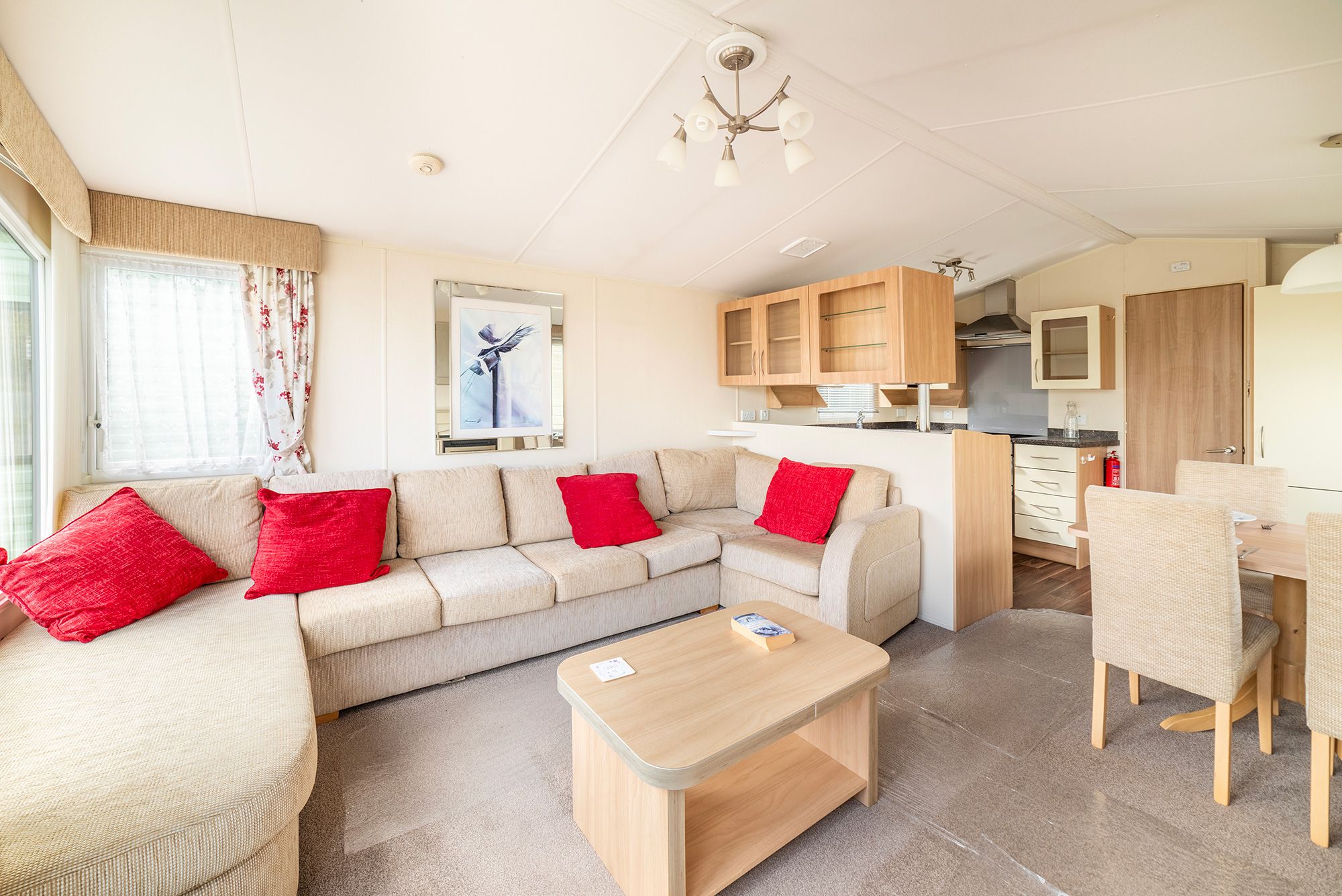 There’s a large corner sofa that doubles as sofa bed, plenty of room for a big TV and a dining table with upholstered chairs that seats 4.
