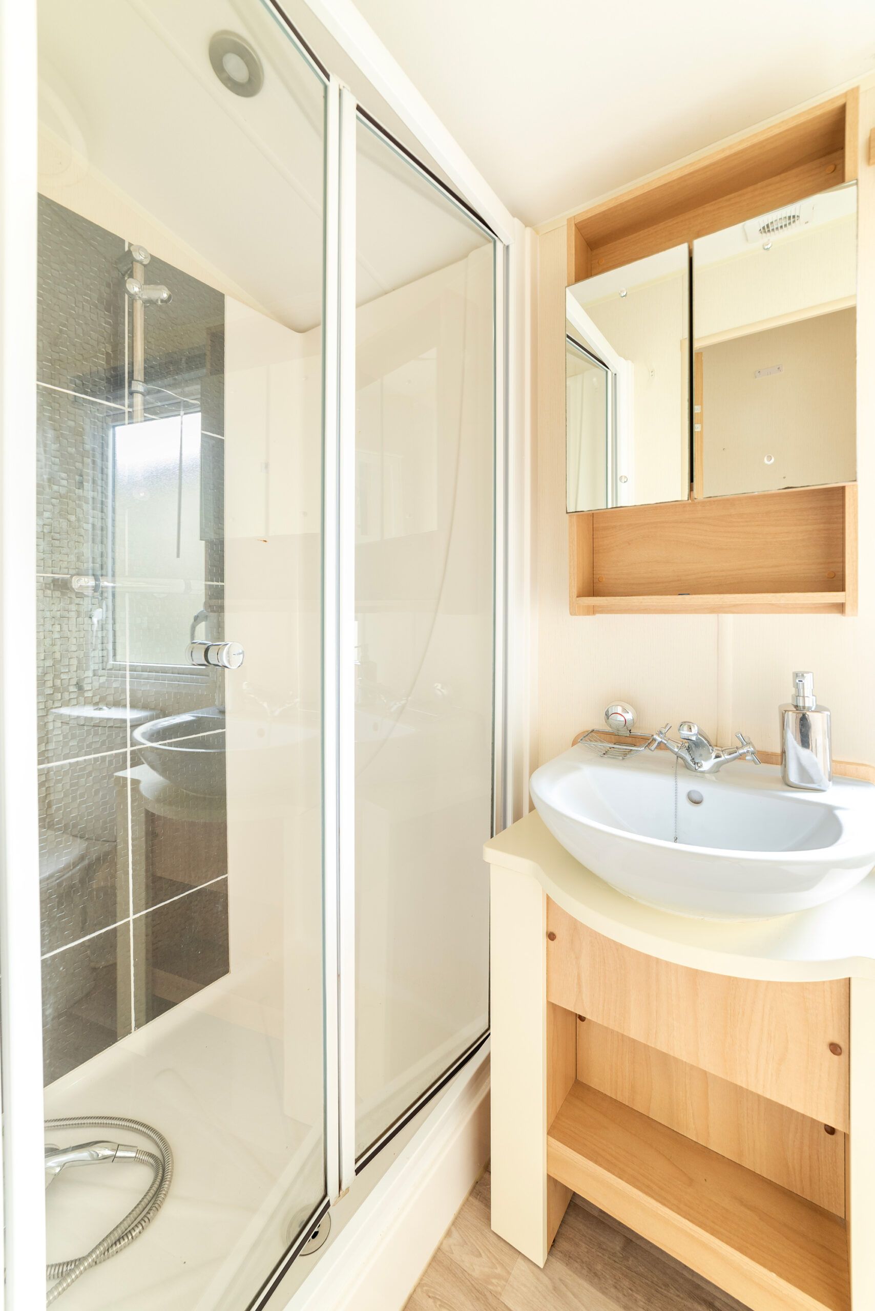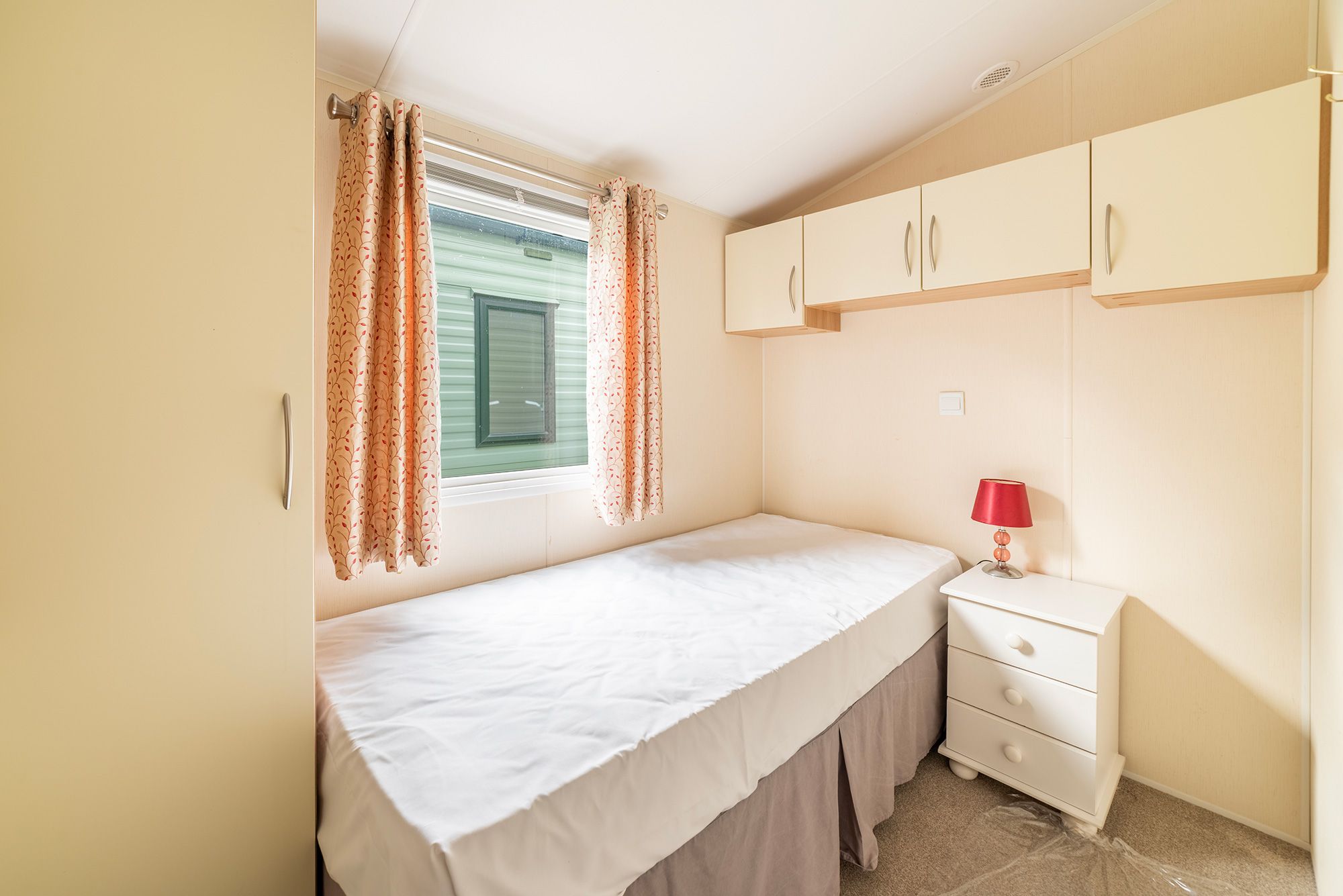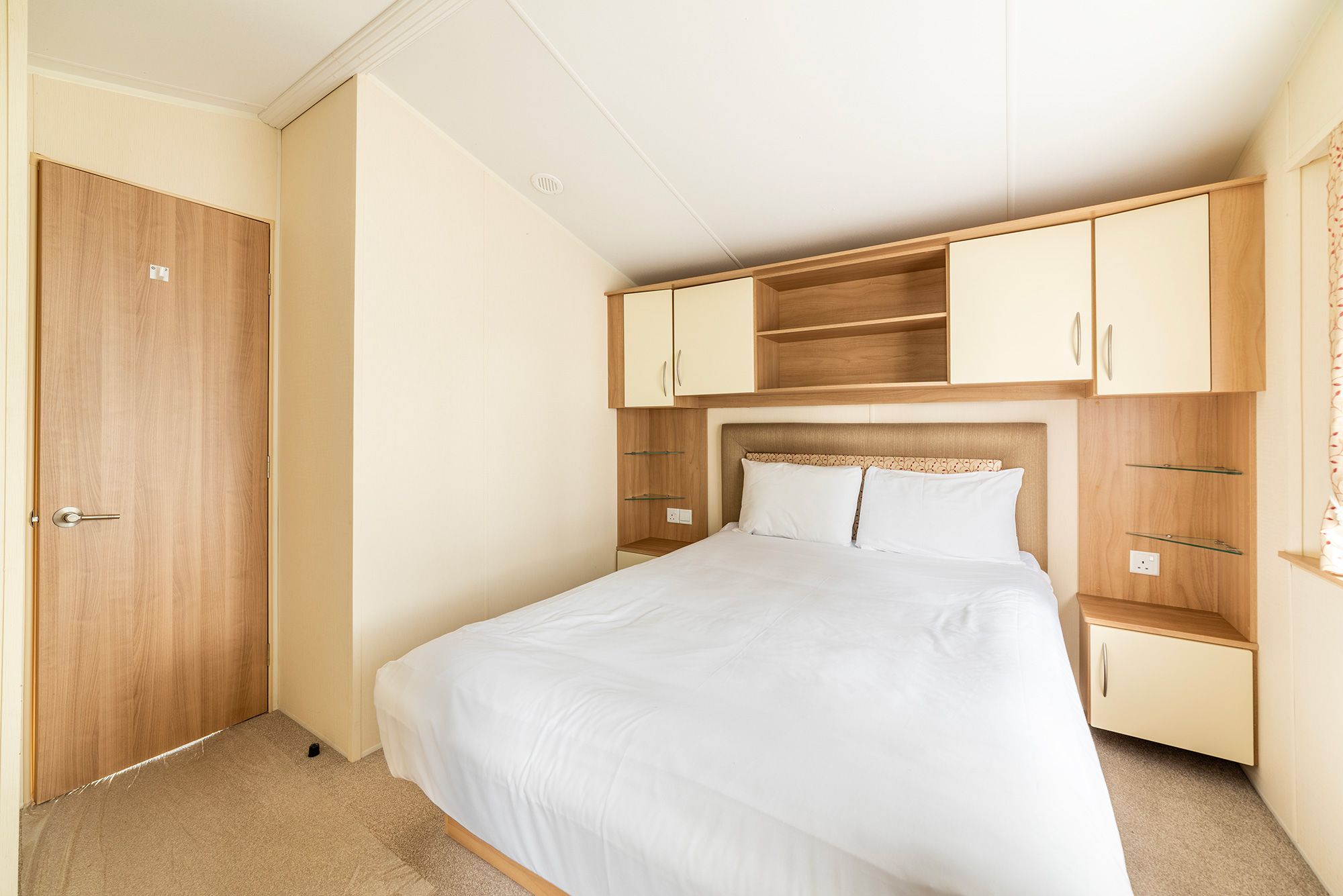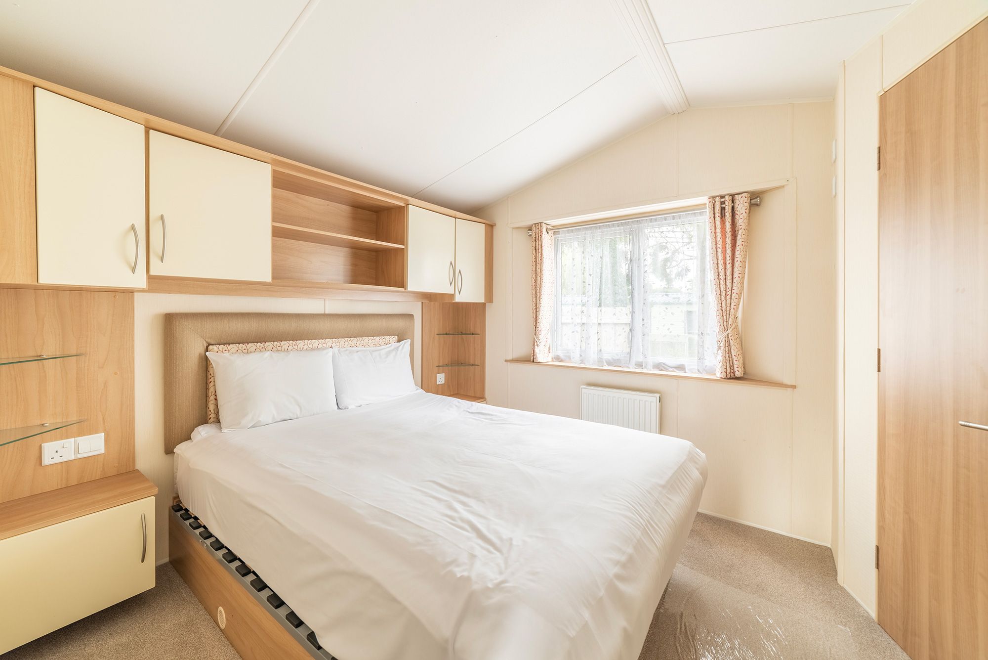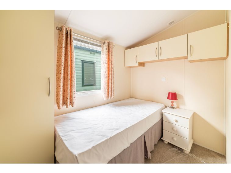 The 2 bedrooms are served by a generous family shower room, whilst the master bedroom has an en-suite WC. The 2nd bedroom has plenty of cupboard space and a wardrobe. The master bedroom is generous with cupboards over the bed and drawer units to both sides. There are mirror fronted wardrobes with drawers under to ensure you’ll never be short of storage.