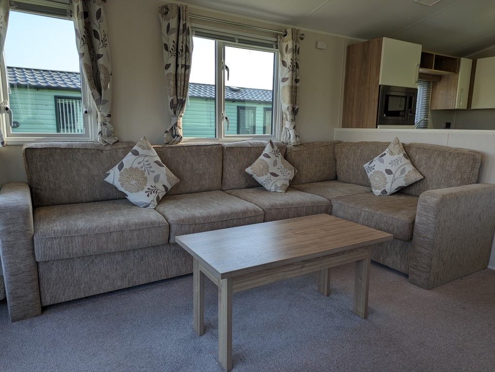 Spacious lounge with corner sofa and pull out bed and a lovely feature fireplace with an electric flame effect fire.